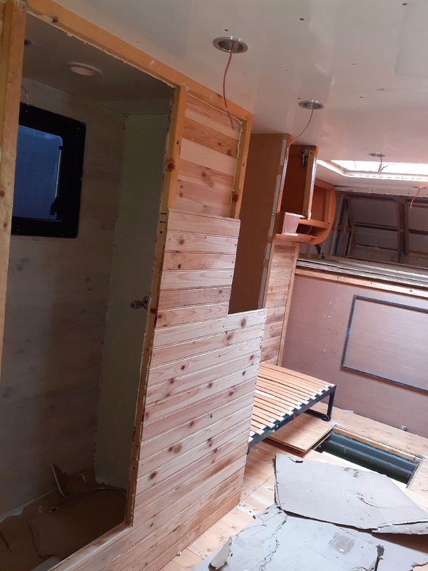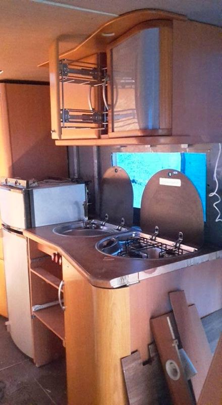 Douche wc en place mais plomberie pas faite electriité non plus. Il y a evier plus gaziniere 3 feux dometic frigidaire très basse consomation. je fournis tout 4 panneaux batteries regulateur. Chauffe eau truma chauffage webasto etc ..