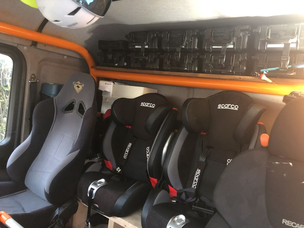 Homologué pour 3 places assises mais aménagé avec deux sièges baquets adultes et deux sièges baquets enfants de marque SPARCO.