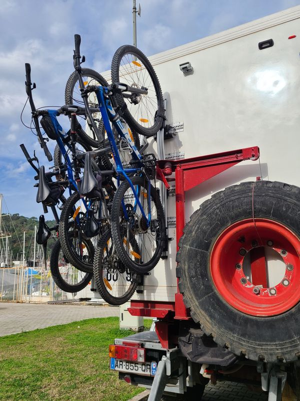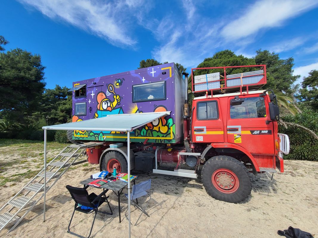 Le porteur, anciennement une citerne de pompier, a été acquis auprès du SDIS Vaucluse via un intermédiaire. Nous sommes donc les seconds propriétaires. Ce camion a été utilisé pour un grand voyage d'un an à travers l'Europe, parcourant environ 40 000 km, sans aucun problème mécanique (voyage actuellement en cours).