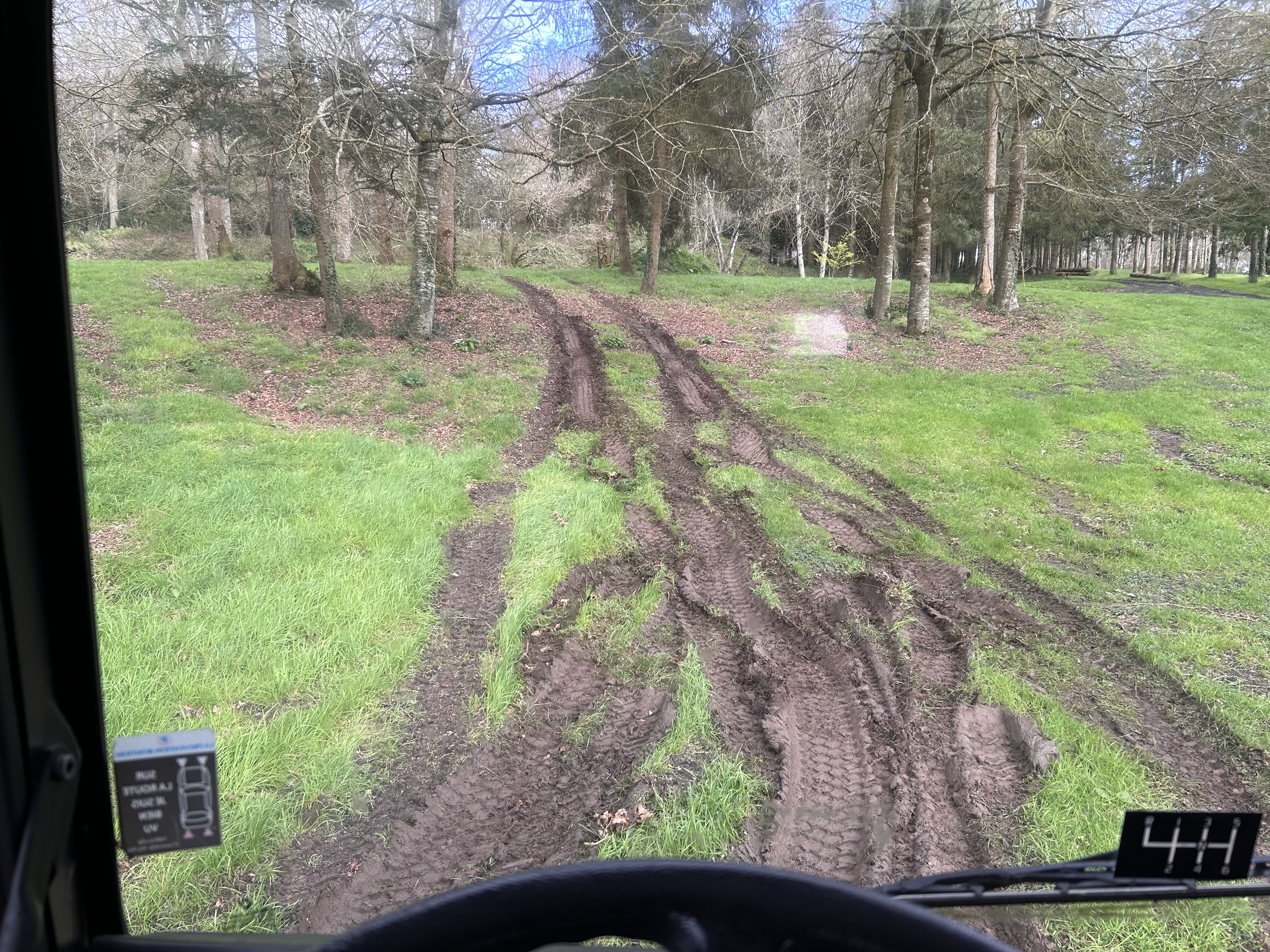 Je rentre les garer sur mon terre plein au haut de la montée en herbe... le Man Kat monte en marche arrière sans creuse ni glisser et ne laisse que très peu de traces.