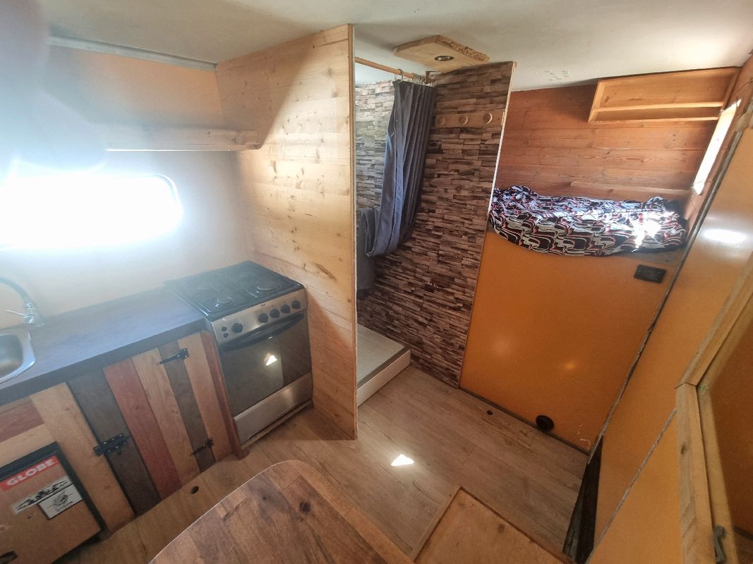 Un petit coin repas avec table et banquette, un coin cuisine avec gazinière, evier, frigo 12v,