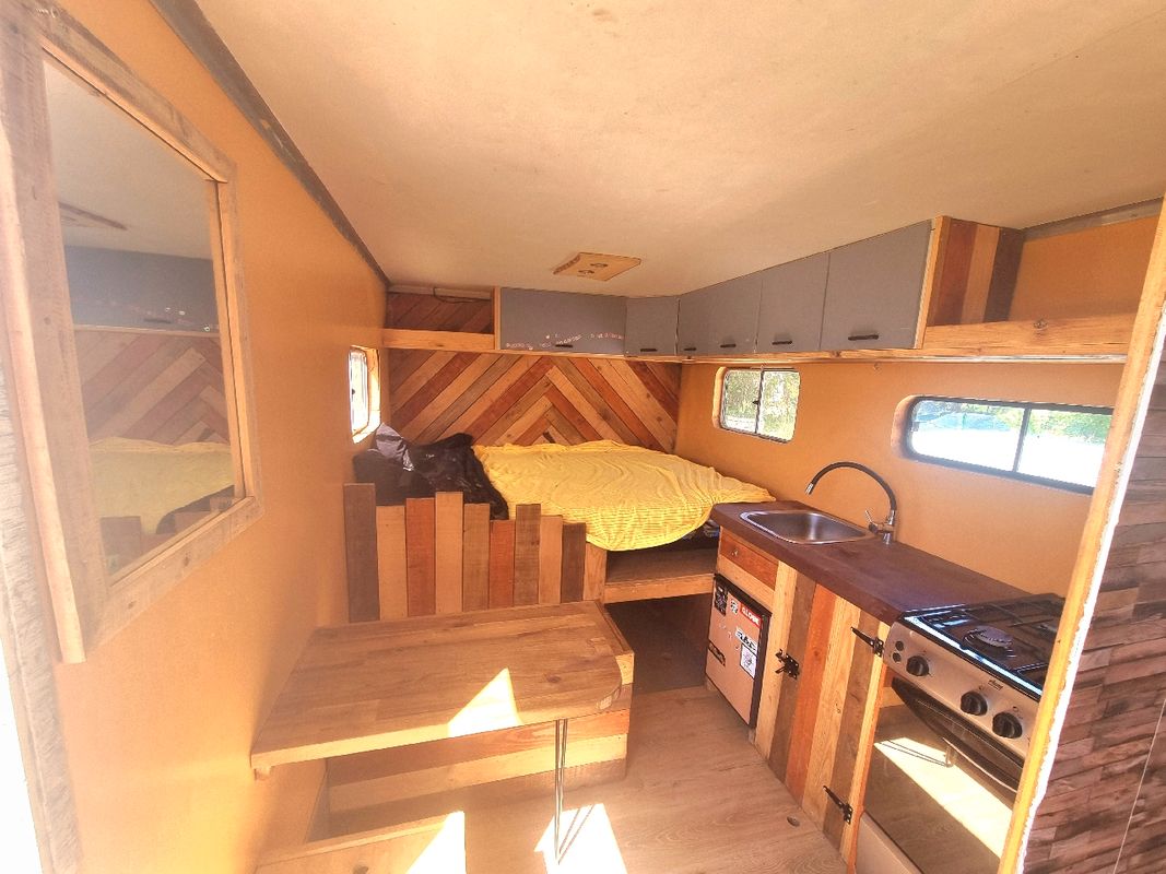 Un petit coin repas avec table et banquette, un coin cuisine avec gazinière, evier, frigo 12v,