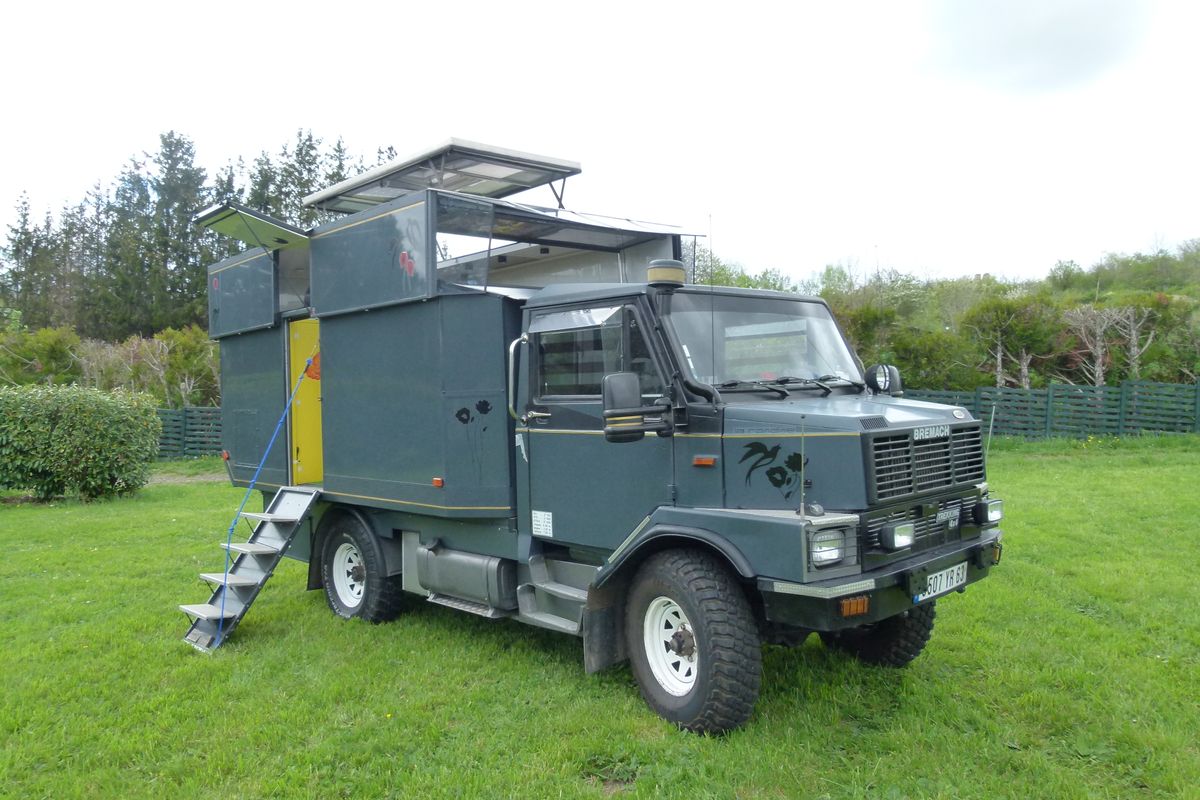 Revêtement extérieur AluPanel Anthracite 3m/m. Pneus et roue de secours BF Goodrich 255x85/16 Neufs à l'avant, usure arrière mais encore satisfaisants. Montée sur faux châssis en lieux et place d'une tri-benne d'origine sur fixations d'origine .La cellule est amovible facilement par quatre béquilles manuelles. Dimensions intérieures cellule 3m60x1m98x 1m20 ht toit baissé et 1m75 ht toit relevé. le toit possède en son centre une ouverture panoramique par croisillons de 2m x 1m x 40ht avec 4 cotés rabattables vitrés acrylique et occultants.