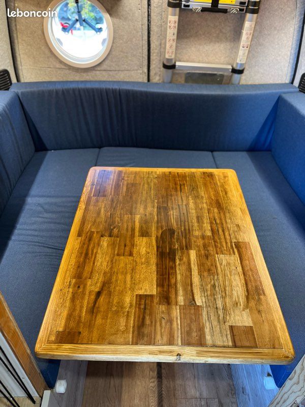 Table du salon avant amovible et installable à l’extérieur, au pied de la cuisine, au niveau de la porte latérale.