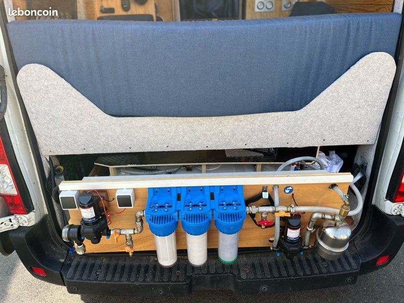 -Système électrique avec pompe pour récupérer l’eau en milieu naturelle avec un tuyaux de 25m, plus 3 filtres relier à une cuve d’eau propre de 80L (cuve d’eau grise de 40L sous le véhicule)