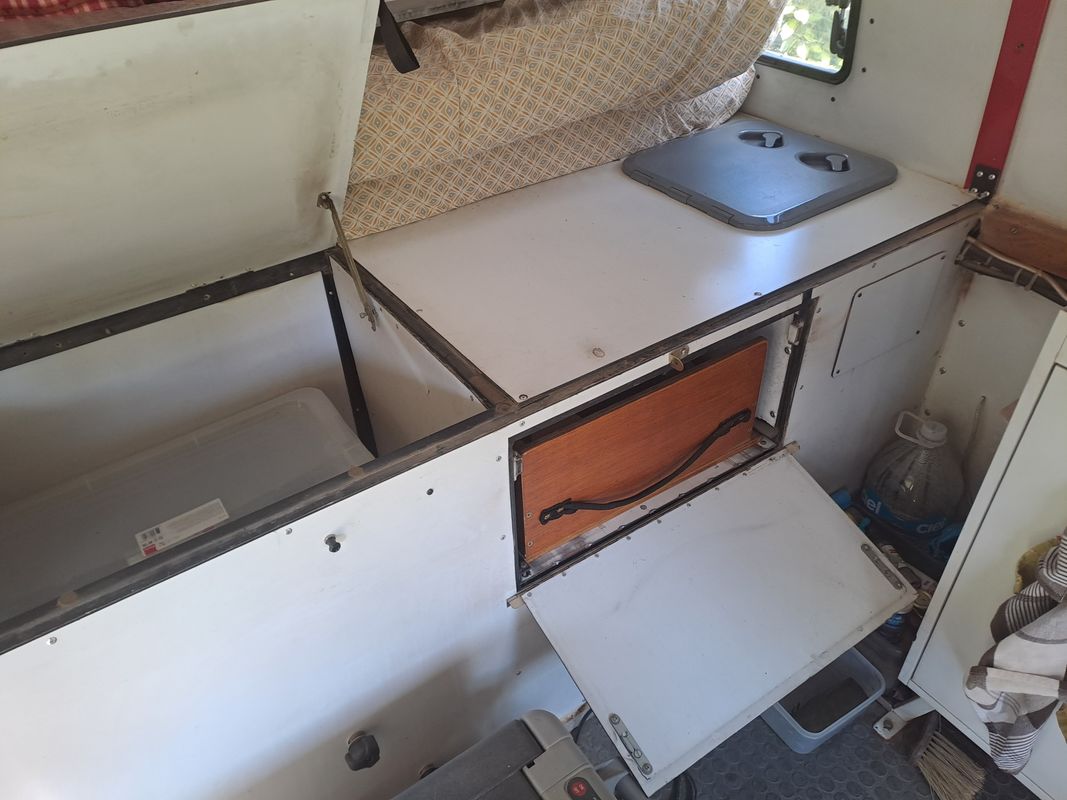 1 coffre AR pour stockage table chaises et oitillage.Chauffe eau 12V pour évier et douche exter.