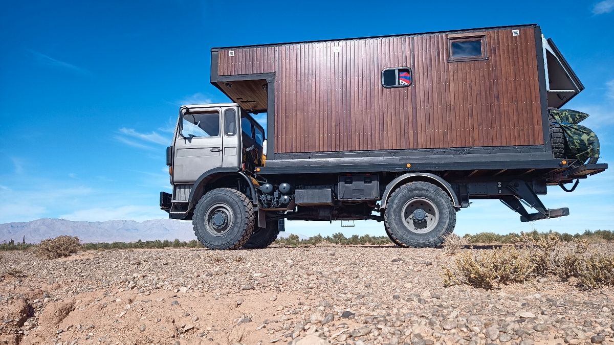 Une chambre deux places 200x140 au-dessus d'un grand coffre de rangement de 110H x 200lg x 140L et la partie technique électrique, accès par l'extérieur du camion ou par l'intérieur via le salon.
