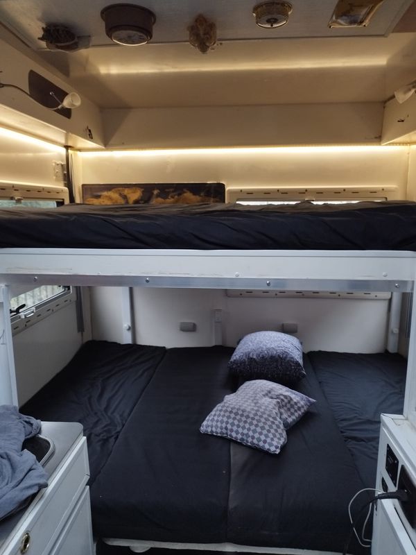 Il est équipé d’un réservoir d’eau propre de 200 et 150 litres d’eaux usées. 2 batteries au lithium de 430 Ampères et 600 Watts de panneaux solaires.