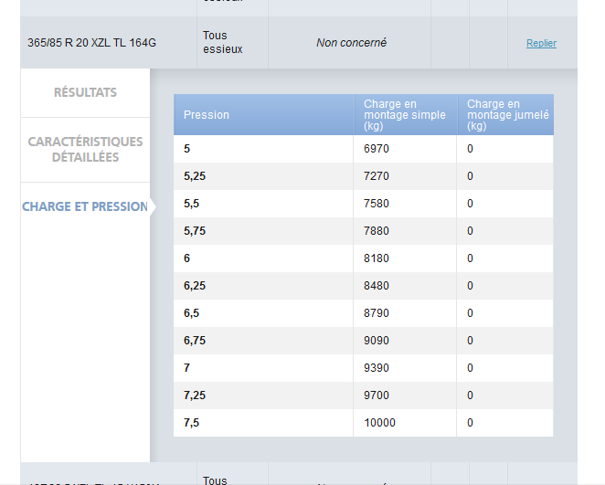 en faisant le calcul inverse (ou sur excel pour les plus vaillants), moi j'arrive à 2.75bars pour 4250kgs (poids sur mon essieu Ar) et 2.50bars pour 3950 kgs (suis à 3800 environ sur le mien)