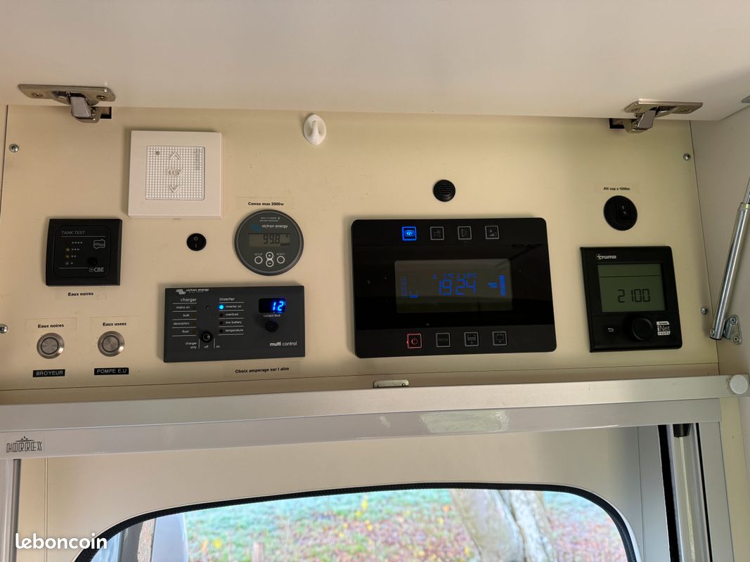 1 Chargeur Convertisseur Vitcron MultiPlus Compact 12/2000W-80A 1 régulateur Victron BlueSolar MPPT 100/50 1 sécurité basse tension 1 disjoncteur diff. 30 ma protection 220 V 4 prises USB - 4 prises 220 V - 1 socle 220 V extérieur - 1 adaptateur femelle mâle