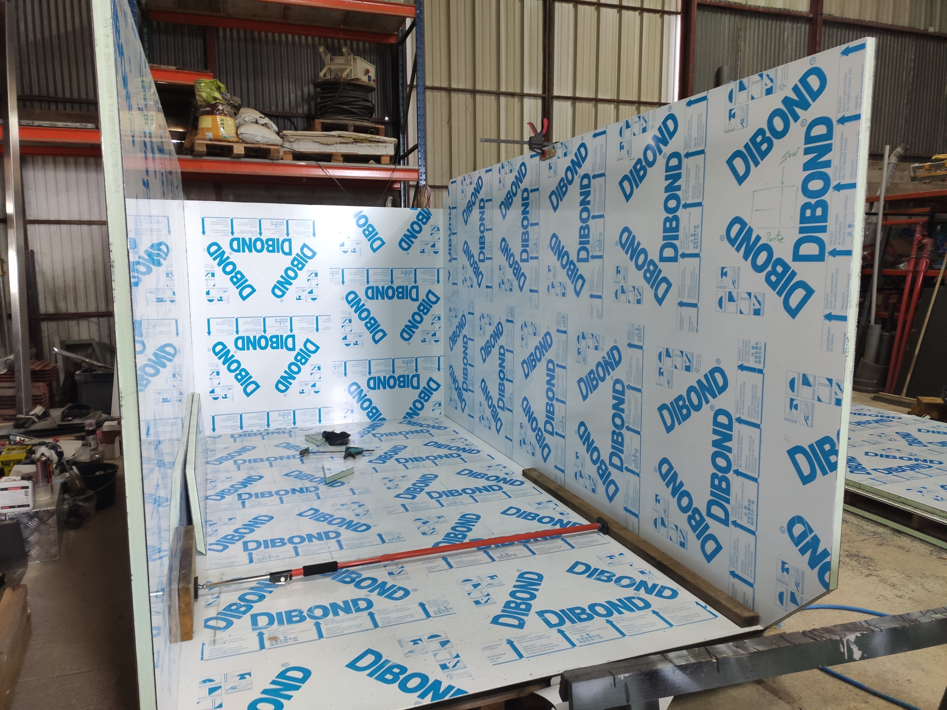 J' ai fait la première avec des plaques alu mousse alu isotoit comme tu dis, moins solide et ensuite toutes de la technique avec dibond les cornières sont en alu 80*80 et 3 mm d épaisseur...