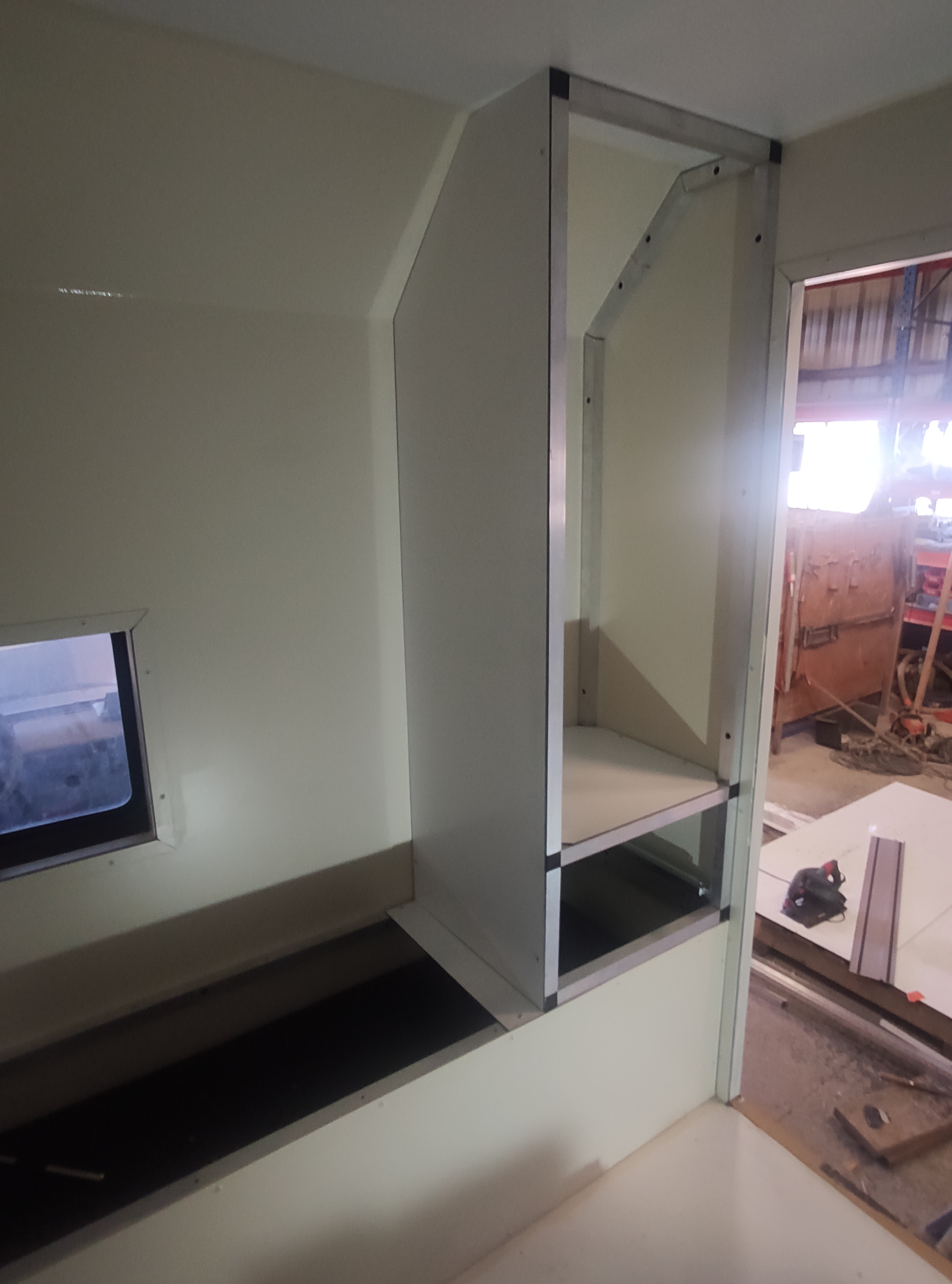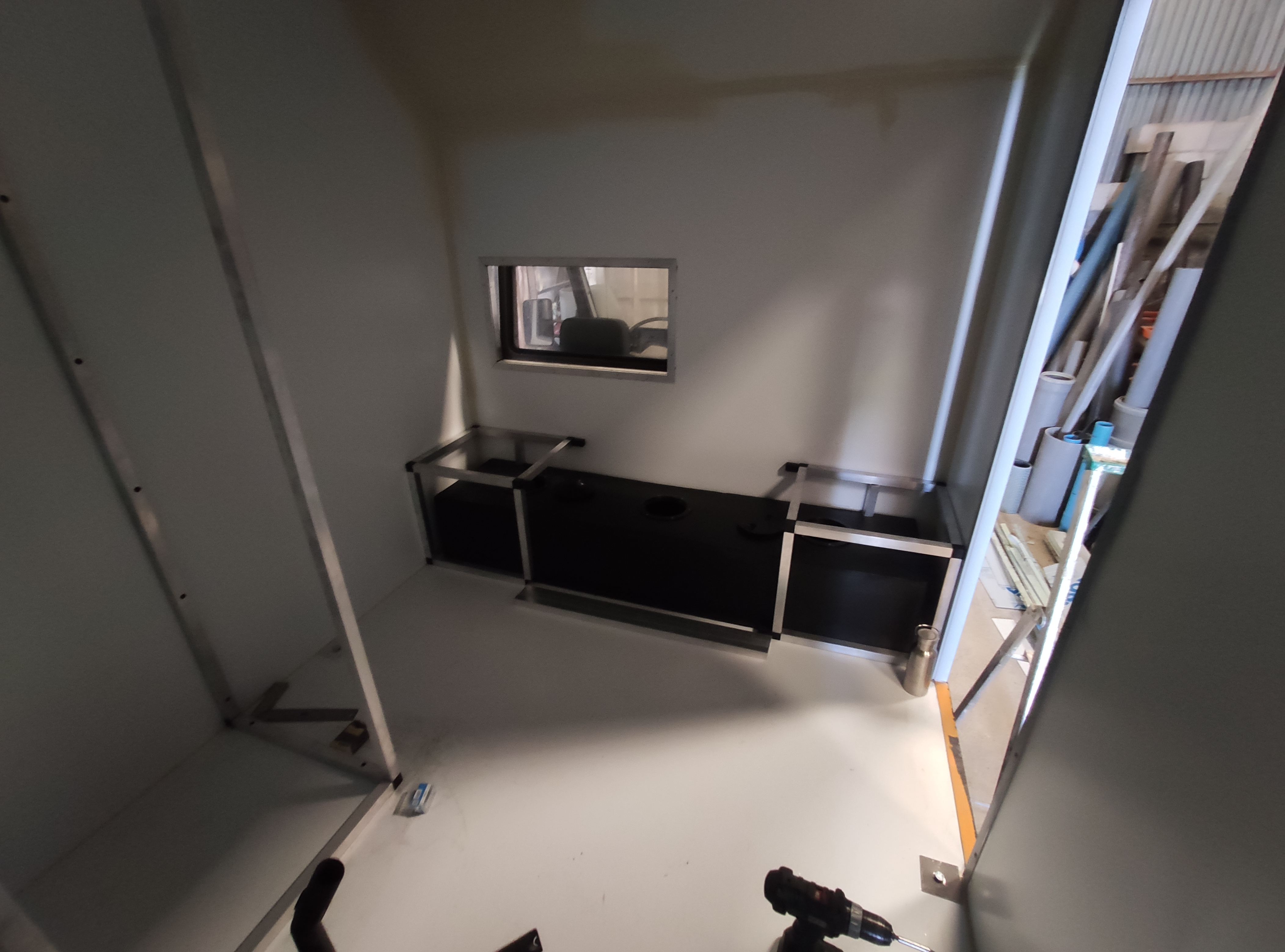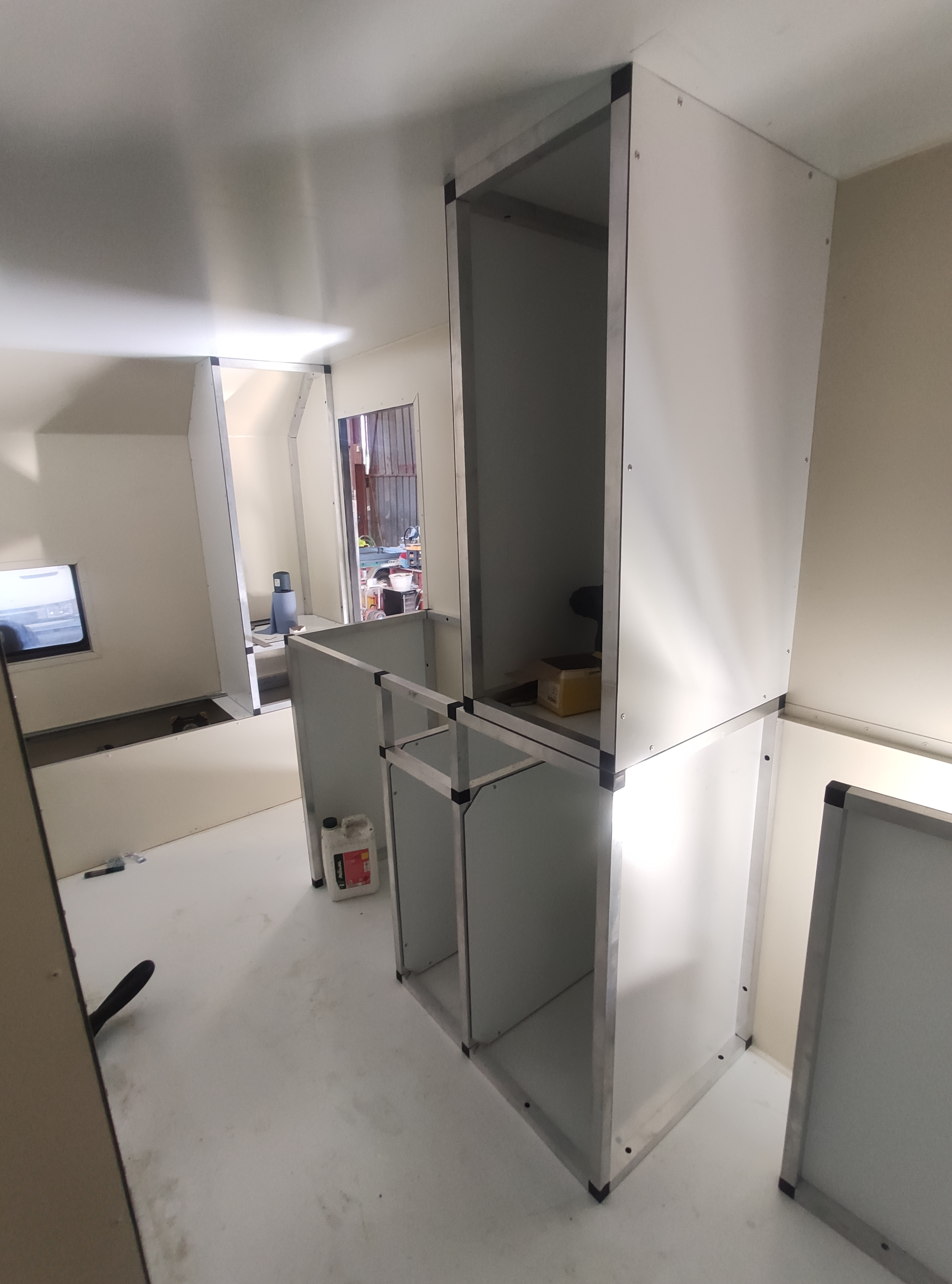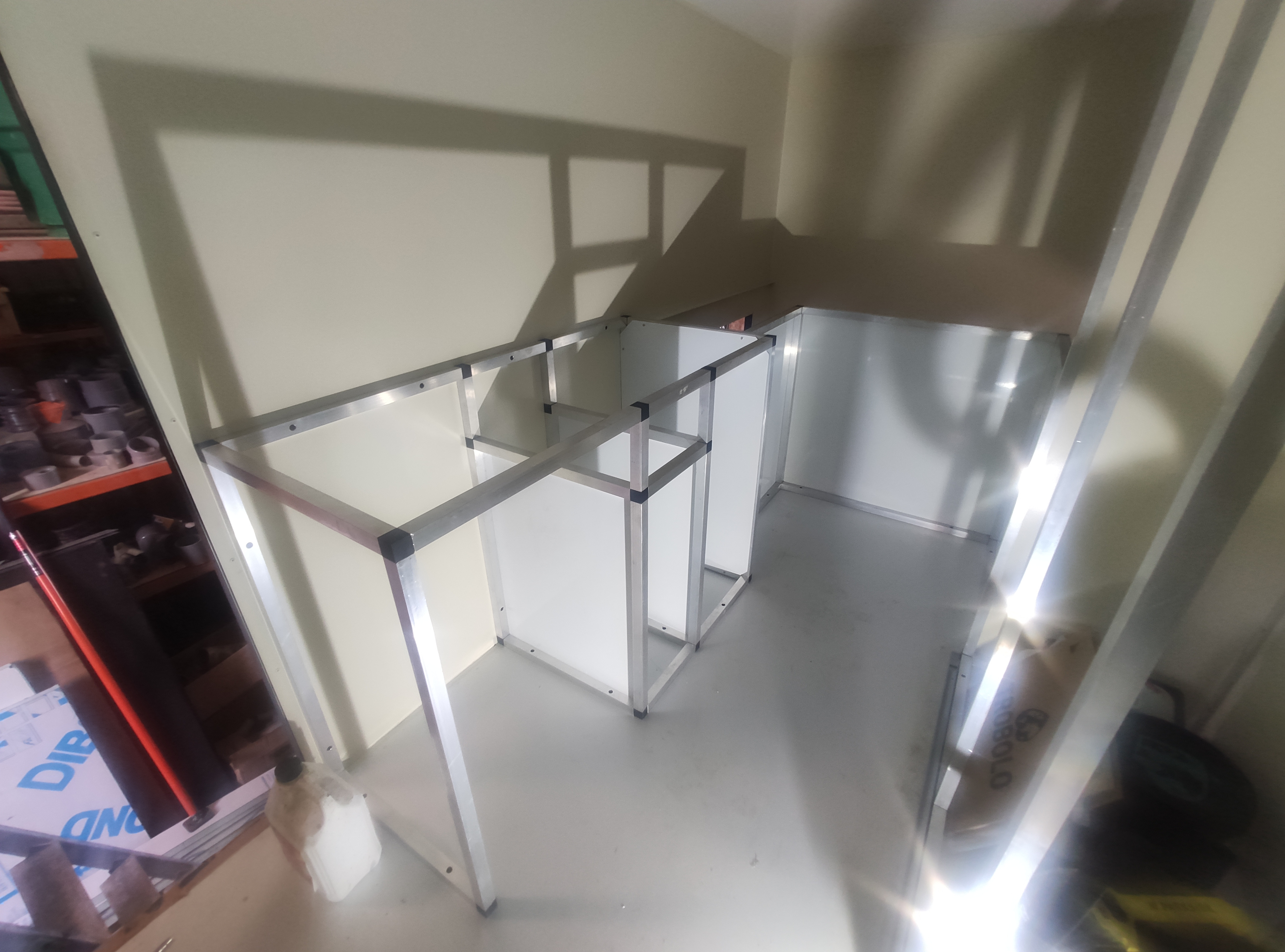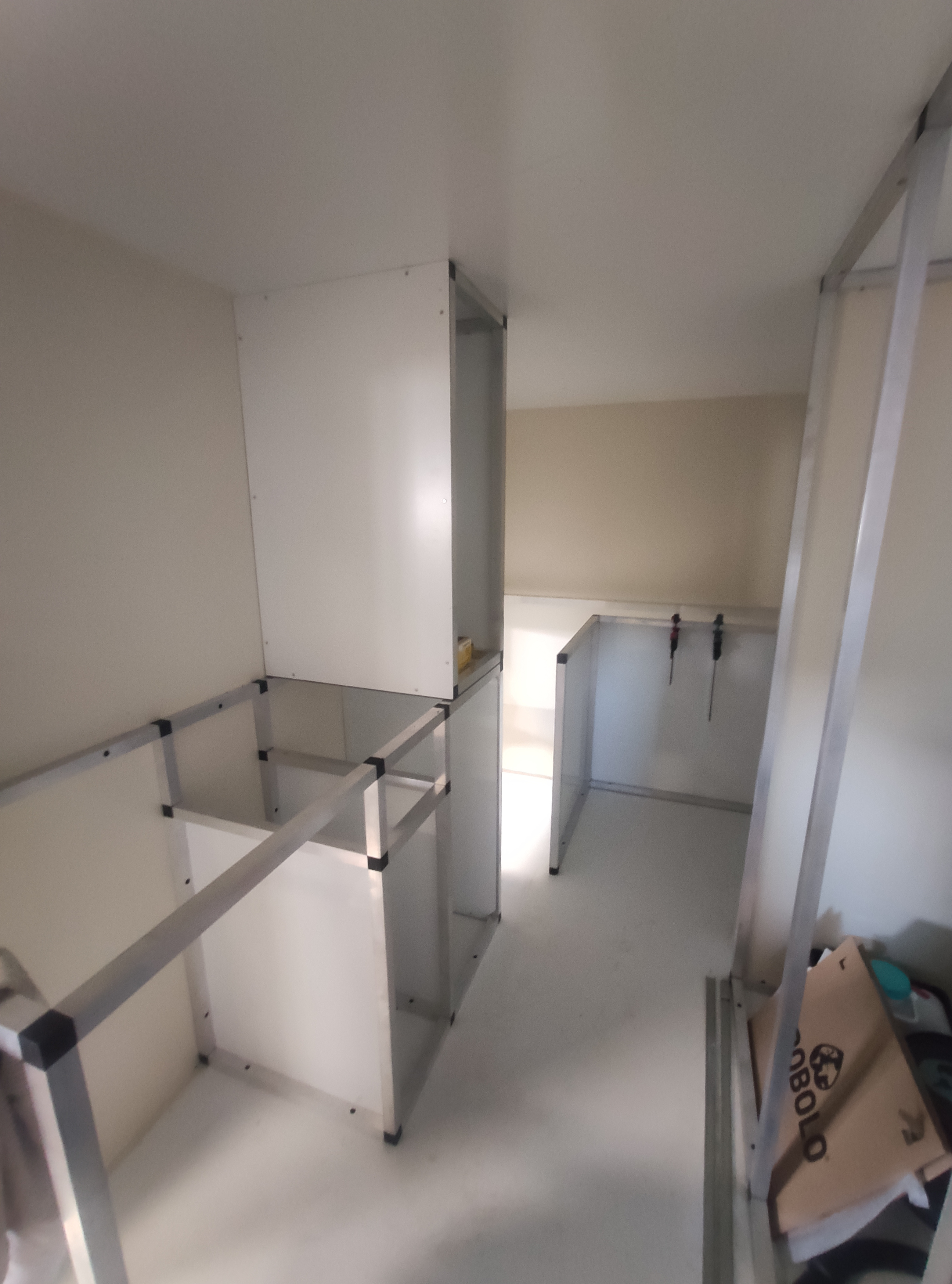 J'ai fais le choix de construire tous les meubles sur ossature alu en 30x30 avec des jonctions en plastique et plaques en dibond...