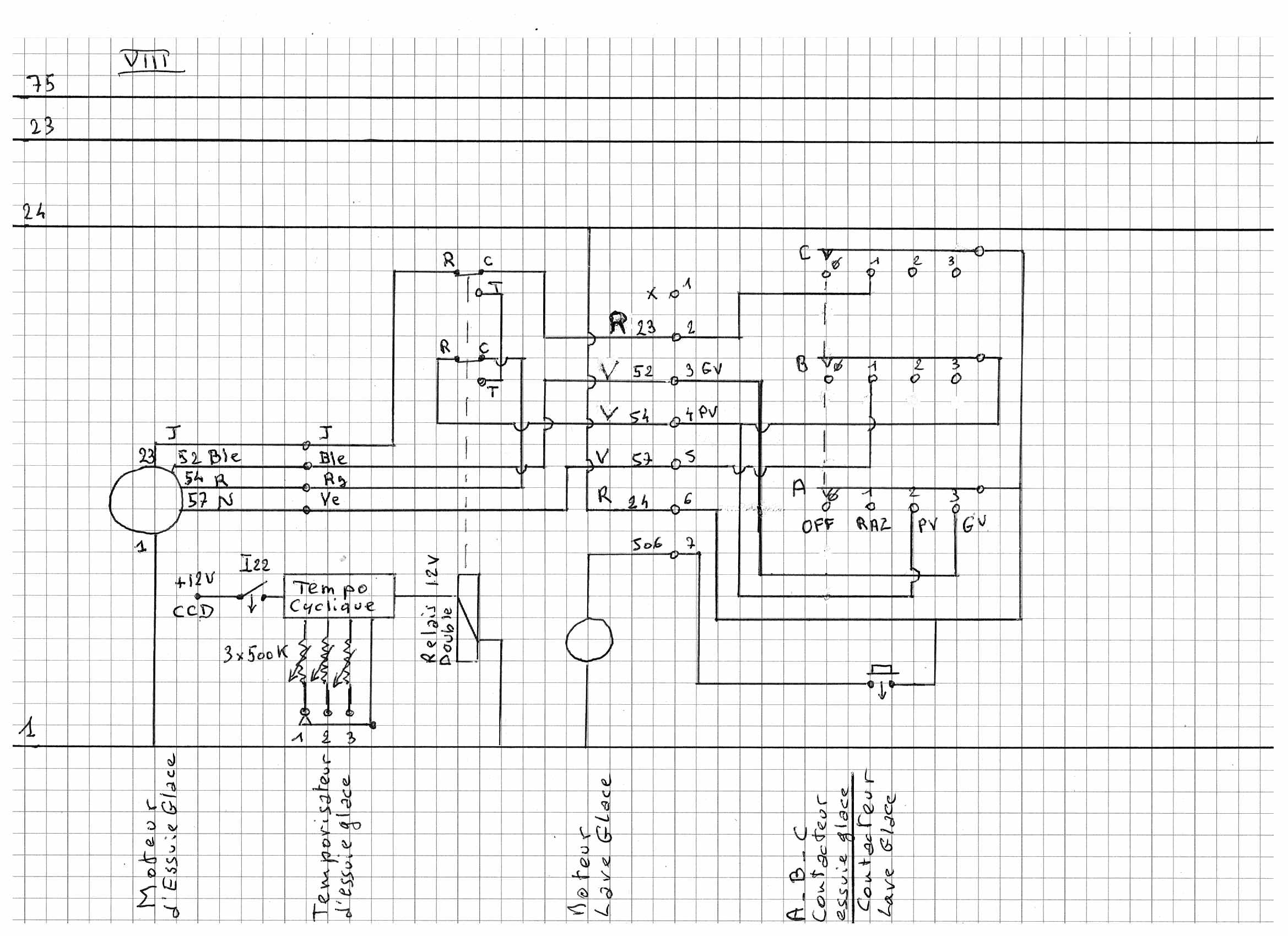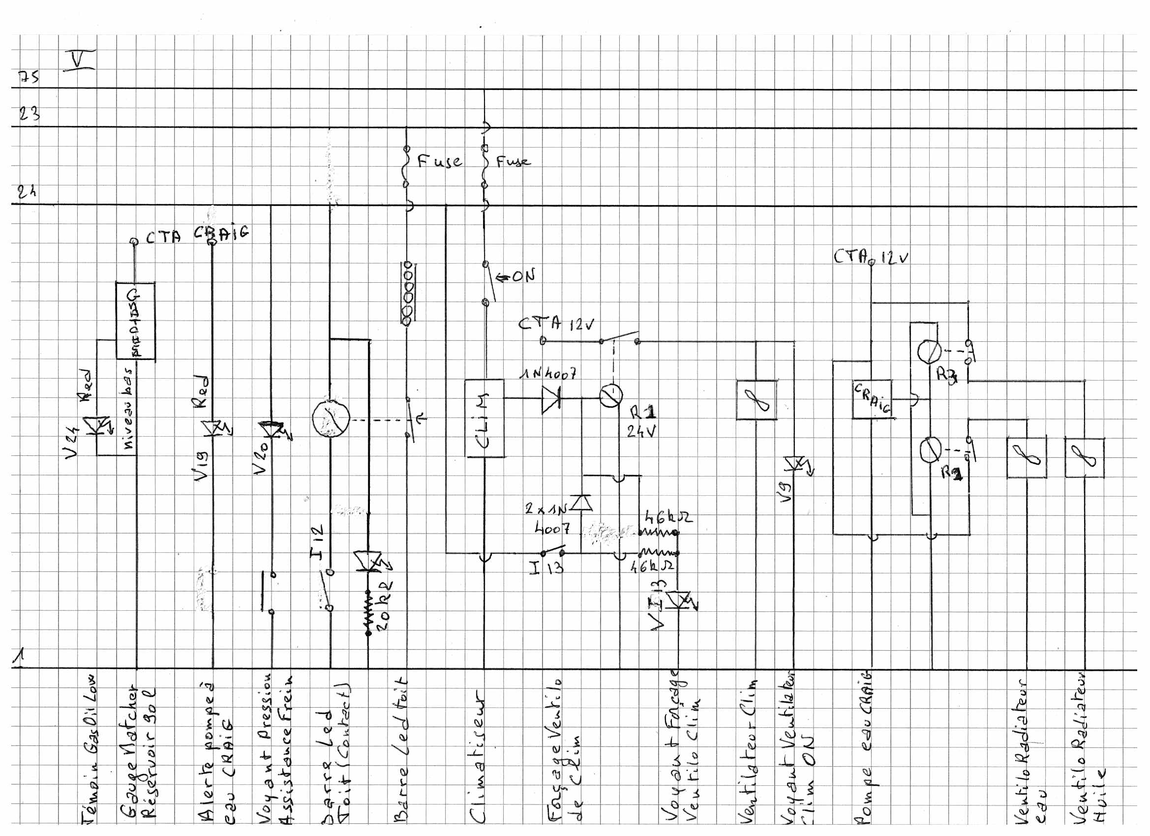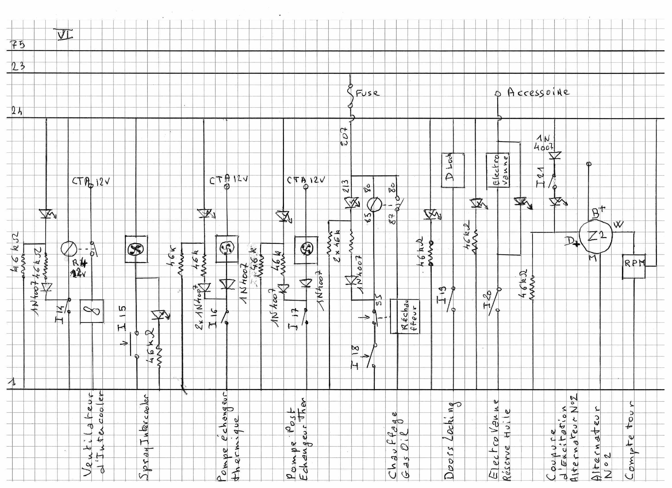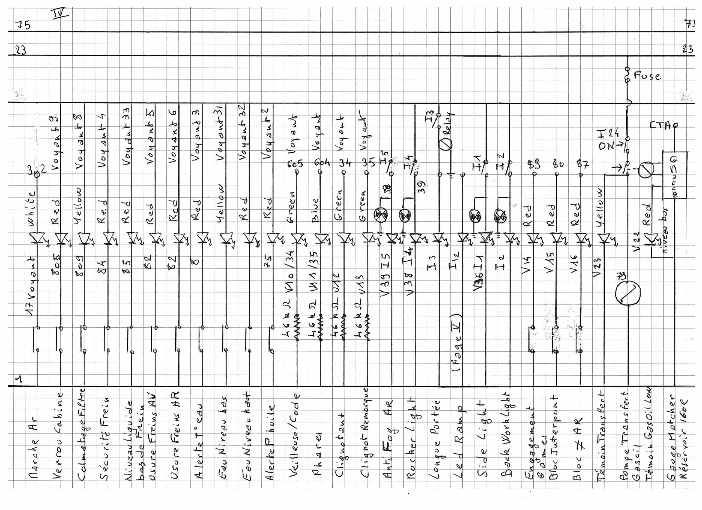 Une fois que l’on a démonté tout ce beau monde il faut, avant de tenter tout câblage, établir le schéma de câblage de l’ensemble du camion et forcement c’est long et comme c’est long eh bien j’ai rajouté de l’électronique pour perfectionner certaines fonctions. Ah j’entends déjà les cris : pas d’électronique, ce n’est pas fiable et ça tombe en panne : eh bien NON ! l’électronique est plus fiable que l’électromécanique (un relais Solid State fera beaucoup plus de commutations fiables, sous réserve d’être bien utilisé, qu’un relais électromécanique classique.