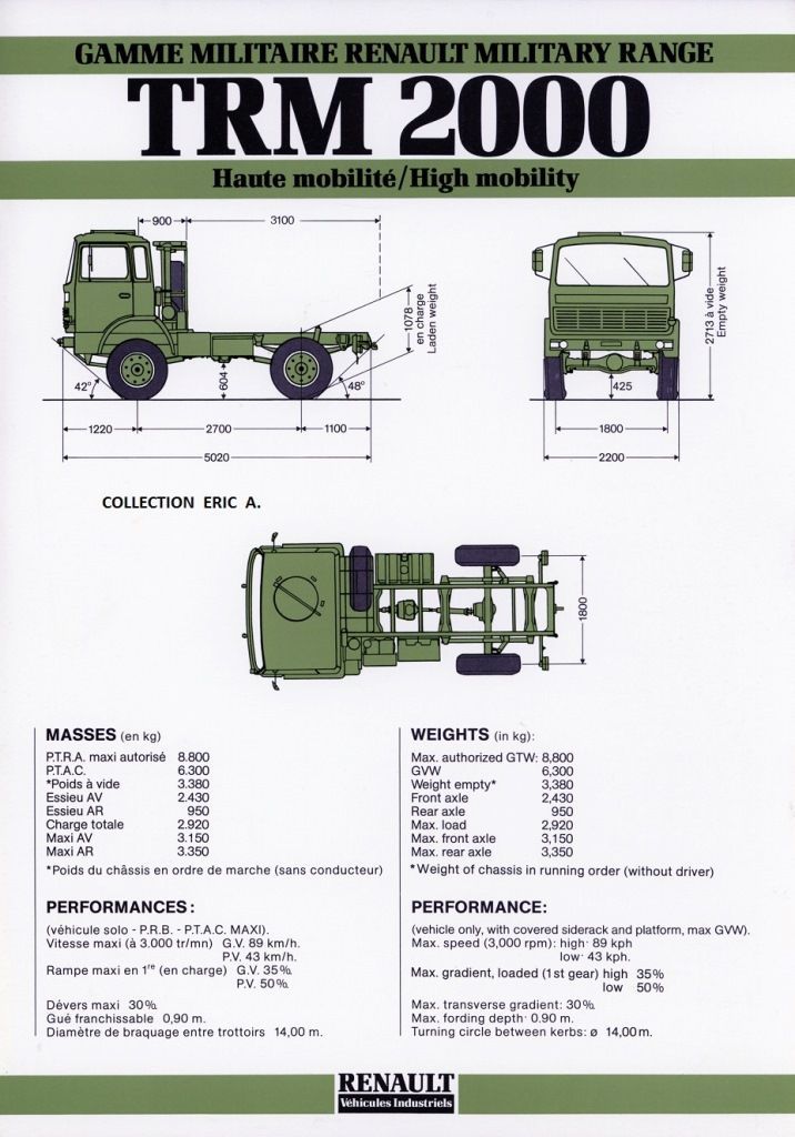 mais qu'est ce qui te motiverait a partir d'un trm2000 pour tout changer dessus en fin de compte ? son poids de départ a vide moins conséquent que ses grands freres civils ? on parle de combien d'ailleurs ? dans un des liens que j'ai mis ou il était fait une comparaison entre trm2000 et ACMAT il y avait quelques docs donnant des chiffres..a comparer peut être aux barrés rouges de camions renault pompier histoire de voir...