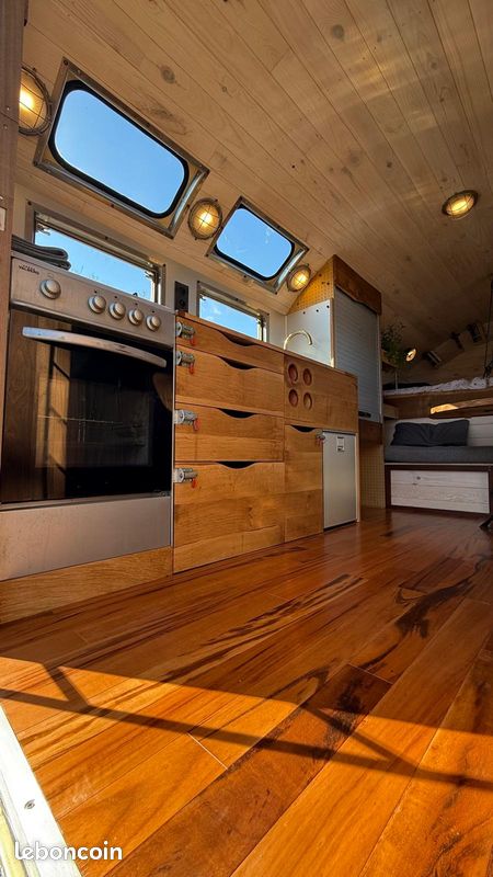 Il est également complètement autonome : 600l d’eau propre, 600w de panneaux solaire, 3000VA de 220V ainsi que 200Ah en 24V de batteries pour le grand voyage.