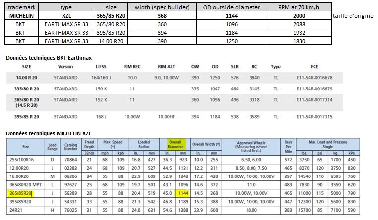 Ce tableau me permet de voir que le 365/80R20 proposé n’est finalement pas l'unique choix, car il va tiré encore plus court alors que j'ai déjà une boite courte...