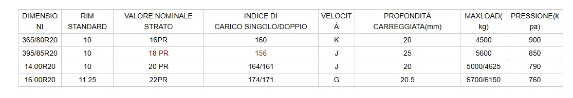 Ayant chargé les fiches techniques, je réfléchis finalement à du 395/85R20 ou du 14.00 R20 dans cette marque.
