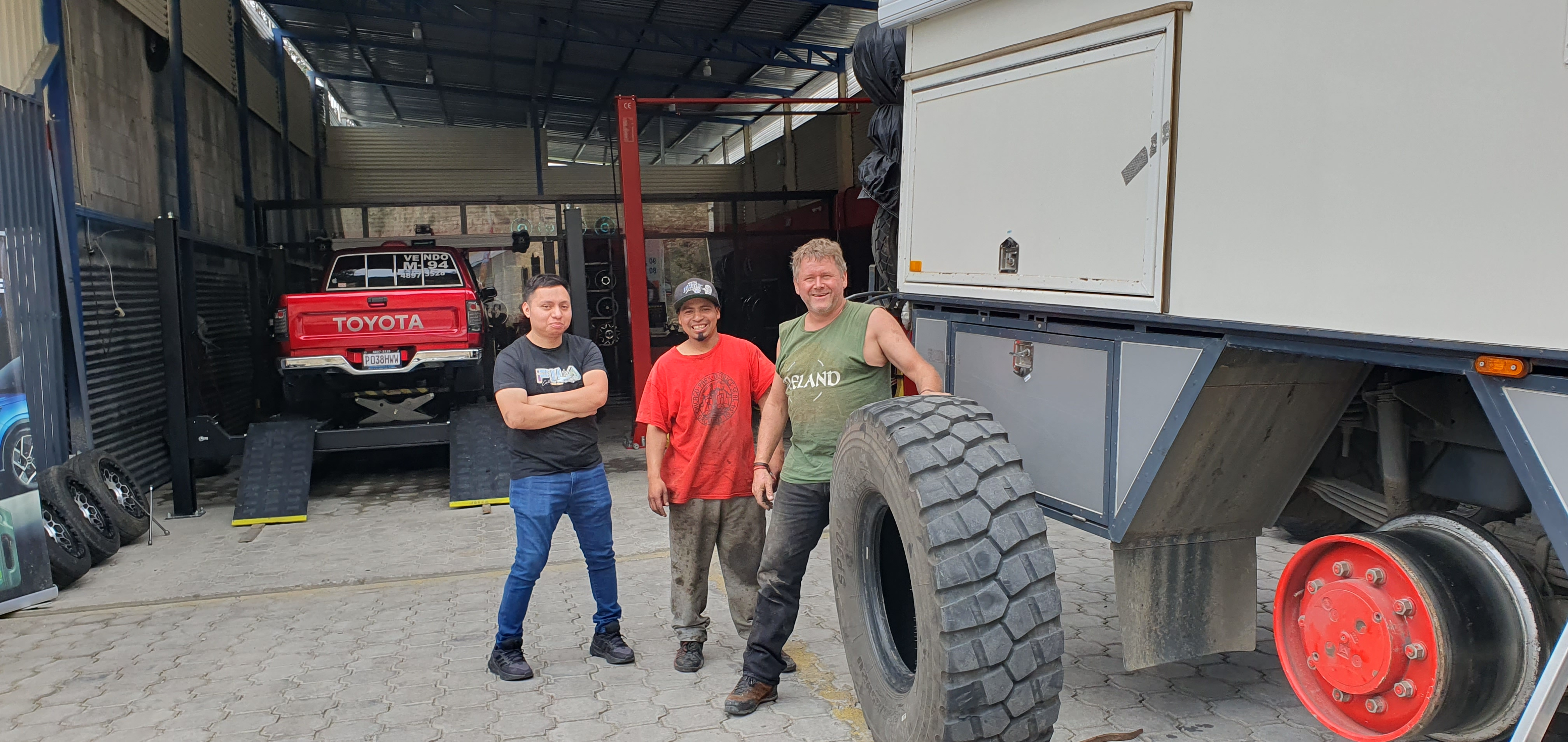 Des nouvelles de mes pneus chinois. Ils sont toujours là. Ils viennent de passer les 11.000 km. On commence à voir une petite usure, essentiellement sur l'extérieur mais ça tient. Zero crevaison. Le mois dernier nous étions au Guatemala, avec pour objectif de permuter les pneus en X et de les retourner int / ext. On a sollicité plusieurs professionnels du pneus PL, des petits ateliers en bord de route. Difficultés de communication, et ils ne connaissent pas les jantes à cerclages donc ne comprennent pas pourquoi il ne faut pas déposer les roues. On a passé notre chemin d'autant plus que ca se faisait à moitié sur la chaussée dans des conditions de sécurité épouvantables. Après 3 refus on a aperçu un atelier de pneus motos et VL, mais avec une belle surface de stationnement en sécurité. On demande aux jeunes, un gars de 25 ans et son apprenti de 16 ans. Ils sont OK pour 100 Quetzales soit 11 euros !! On comprend bien au prix proposé qu’ils n’imaginent pas un instant l’ampleur du travail, et les premières minutes montrent que la pratique PL leur est totalement inconnue. Bref, ils nous mettent à disposition leur parking et nous prêtent leur matériel (cric et démonte pneus). En 3h30 Armelle et moi avons déposés inversé et retourné les 4 pneus de 92 kg chacun, montés bien serrés, sans déposer une seule jante. Nos hôtes ont vite renoncé et ne se sont pas trop salis les mains mais ils étaient super sympas et disent avoir beaucoup appris. On leur propose 200 Quetzales, ils sont super contents, et nous aussi. Par contre 3 jours de mécanique lourde (voir les autres posts), après 11 mois de voyage sans trop grosse besogne, je suis épuisé, plein de courbatures...