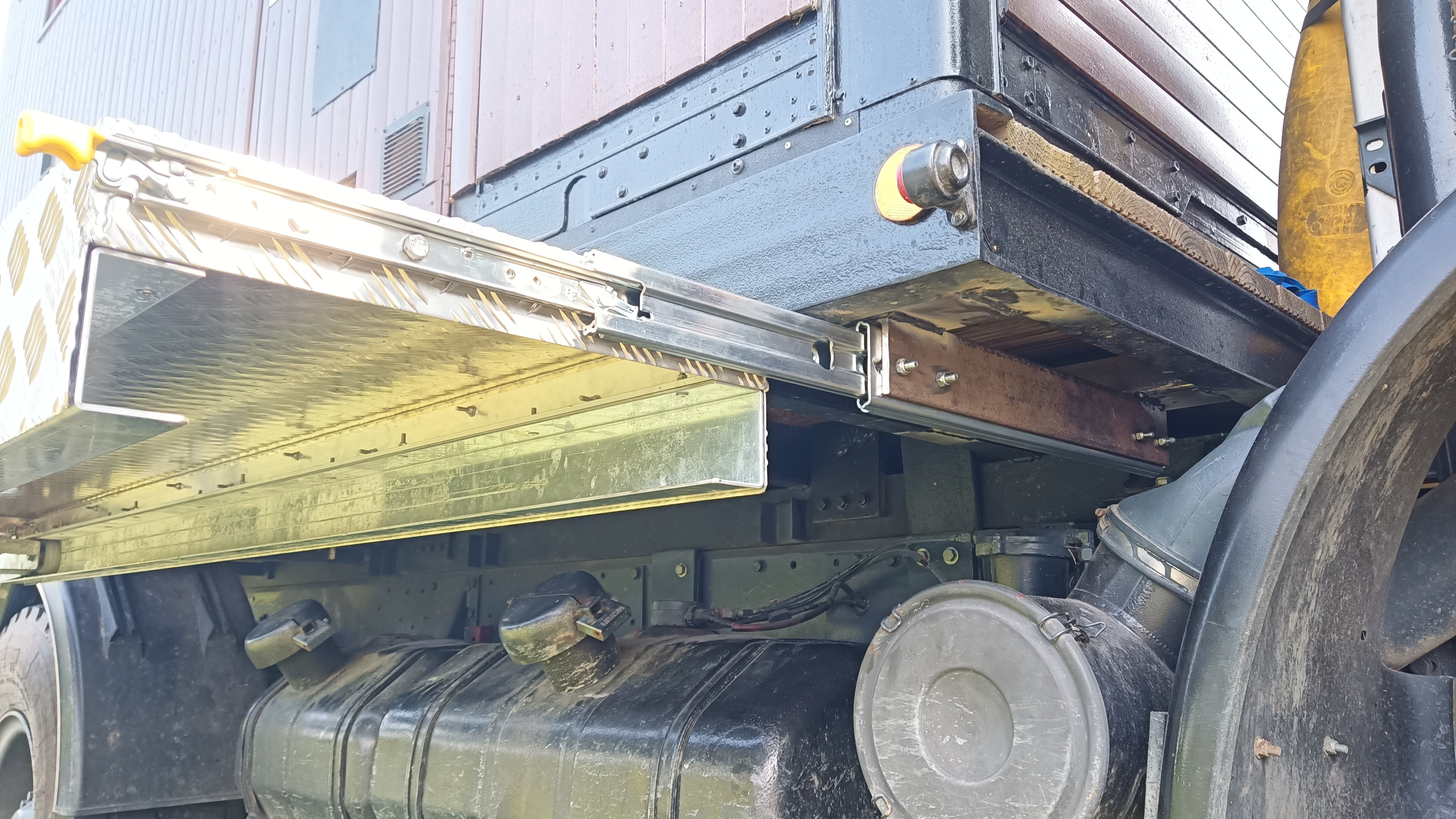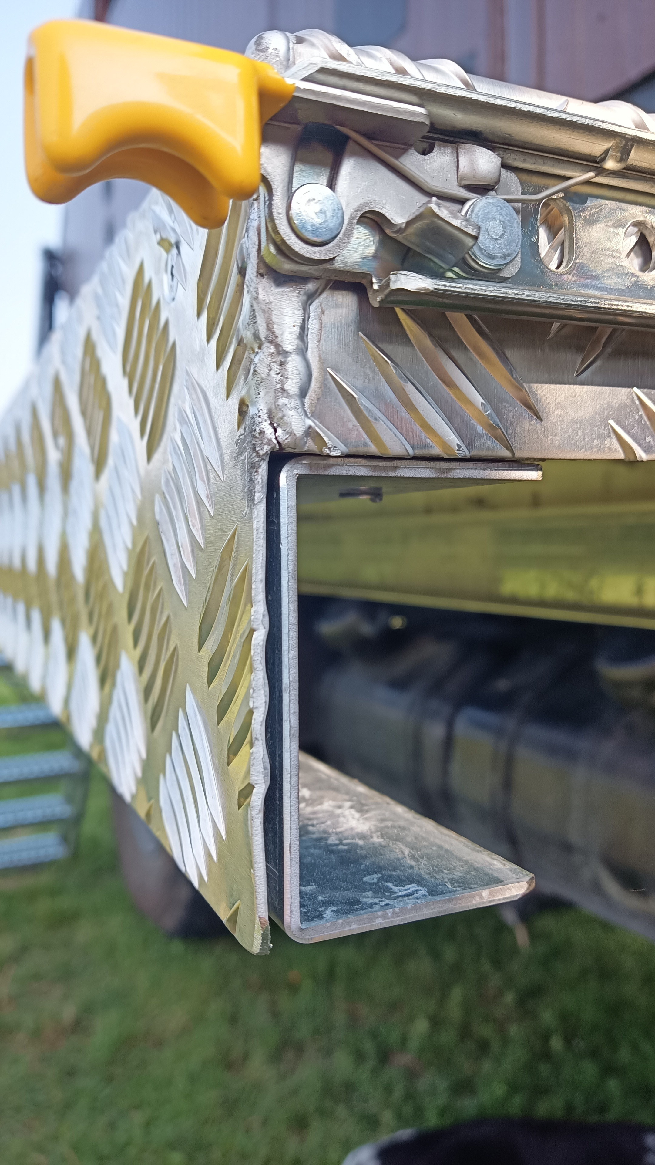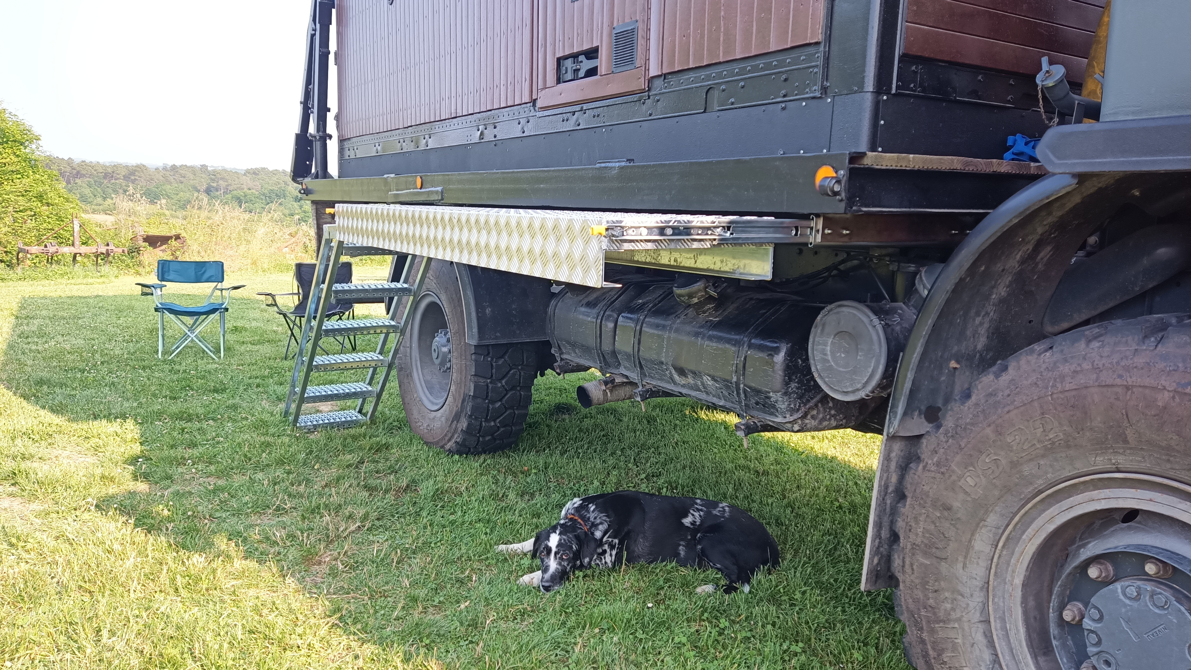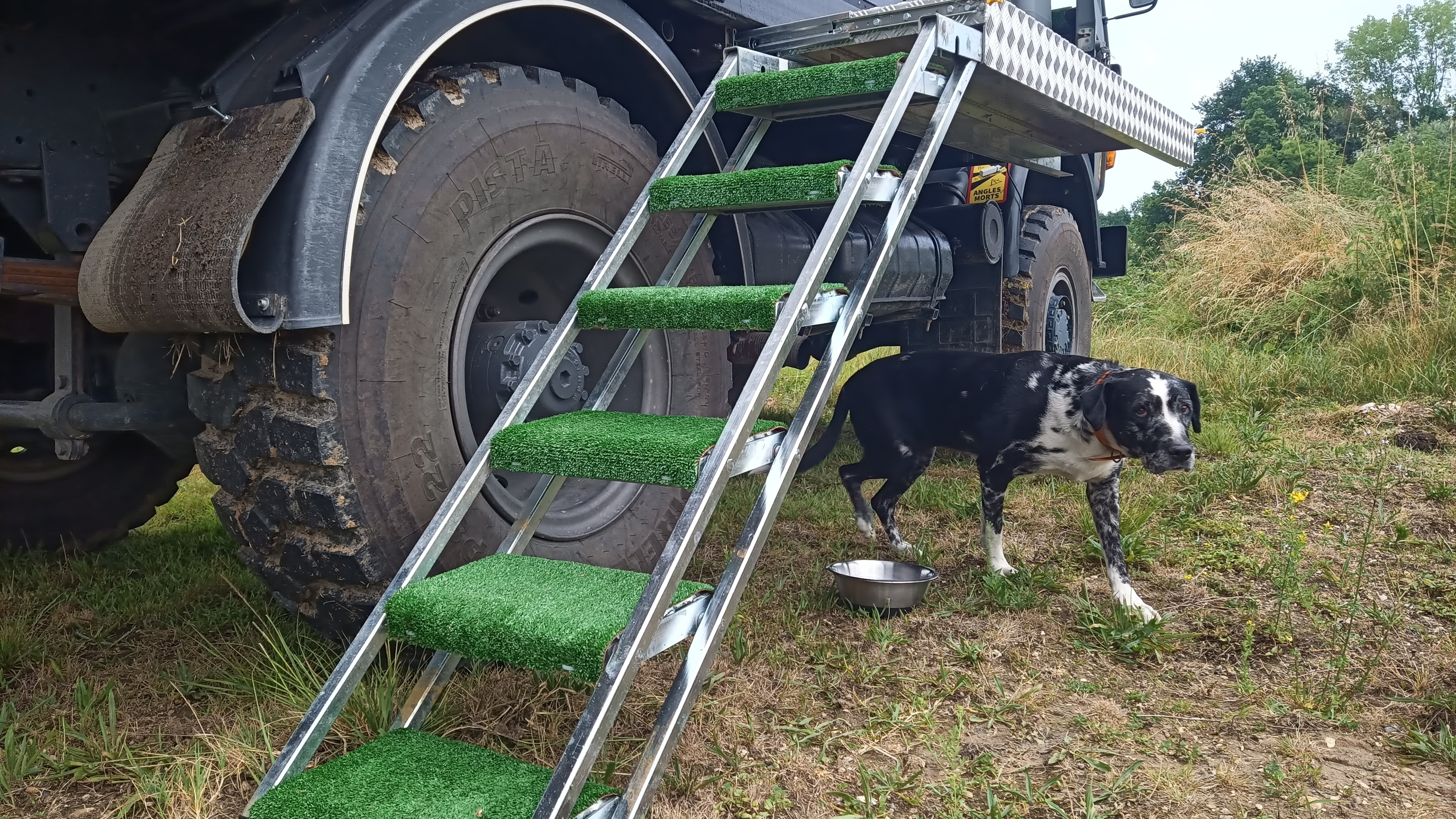 Pour le confort de mon vieux chien qui galère avec ses veilles rotules, je me suis installé une échelle sur mesure avec une pente douce de l'échelle pour le Toutou