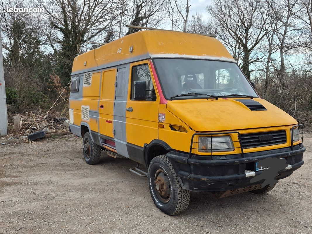 J'avais déjà croisé sur la route cette version de Daily 4x4 qui n'existe pas au catalogue. Il s'agit toujours de nez de cochon à cause de l'empattement de 3,20m qui est commun avec le Daily 2RM jusqu'en 90. Avec le changement de museau, le van a pris 10 cm de plus ce qui a permis d'aligner la porte laterale au seuil entre la cabine et le plancher de chargement. Le 4x4, lui, est toujours resté à 3.2m ce qui oblige à utiliser l'ancienne caisse lorsque l' on veut faire ce montage.