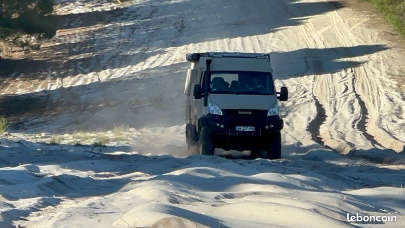 Rodéo, notre camping-car d’expé ultra capable. Le porteur est un Iveco daily 4x4 modèle de 2009 (pas d’AdBlue), avec le super moteur 3L Iveco de 176 cv (repro à environ 230cv / 450 Nm). Bcp de travail dessus, pour personne connaisseuse et vraiment intéressée. Toit relevable, hayon qui s’ouvre complètement à l’arrière, WC à combustion, chauffage et cuisine au gaz, compresseur embarqué, 3 jeux de roues, 24 vitesses + tous les blocages de différentiel, nouveau radiateur, nouvelles suspensions réglables, 1000w de panneaux, solaires, 400 A de batteries auxiliaires au lithium, convertisseur 3000w, 250L d’eau fraîche + 50L d’eaux grises, bbq extérieur rétractable, treuil, auvent 2 façades etc. etc. la liste est longue. Merci de me contacter ici ou par WhatsApp pour plus d’informations. Le véhicule est actuellement chez Globe Camper à Narbonne pour l’installation des nouvelles suspensions et je devrais le récupérer d’ici peu. Véhicule homologué RTI en France et immatriculé en VASP (5T5). Prix négociable dans la limite du raisonnable. Et devant le véhicule.