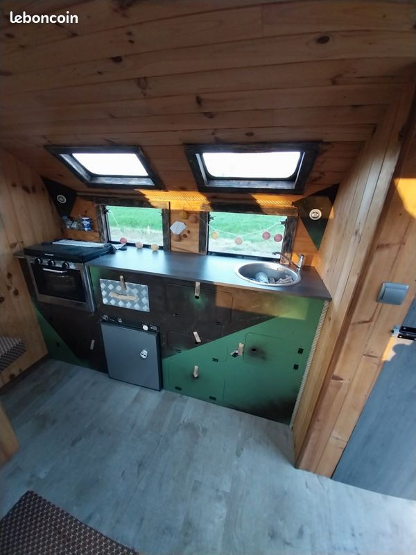 Cellule schelter 5,20 x 2,4 aménagée douche cuisine lit four frigo 300 l d eau propre
