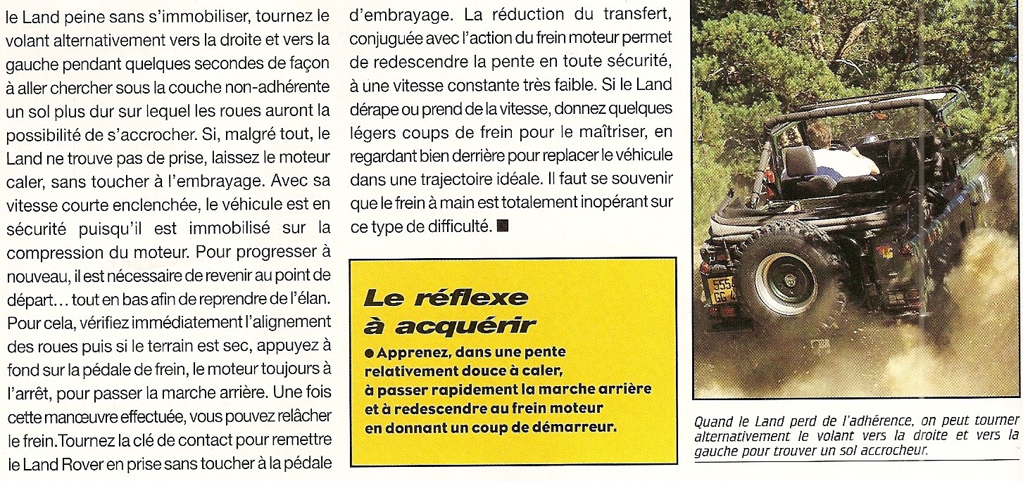 maximillian, sur un autre post a écrit :Dès que la combinaison montée/adhérence fait que ça patine et ne monte plus, ou lorsqu'on se fait piéger et qu'on cale et que "ça ne tient pas", il faut immédiatement avoir le réflexe de passer la marche arrière et donner un peu de gaz pour redonner de l'adhérence aux roues, pour redescendre en marche arrière vers une zone plate en contrôlant la trajectoire.