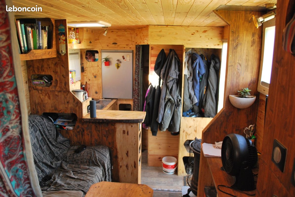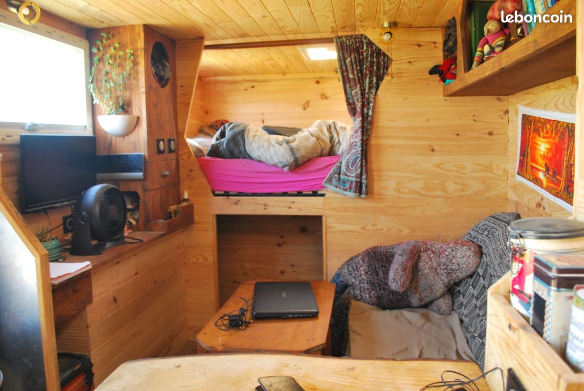 Lit 140 x 190, coin canapé, tv, soutes dans faux plancher sur la moitié de la surface. Il serait possible de remplacer le coin canapé par 2 banquettes et une table qui se baisse pour créer un second lit.