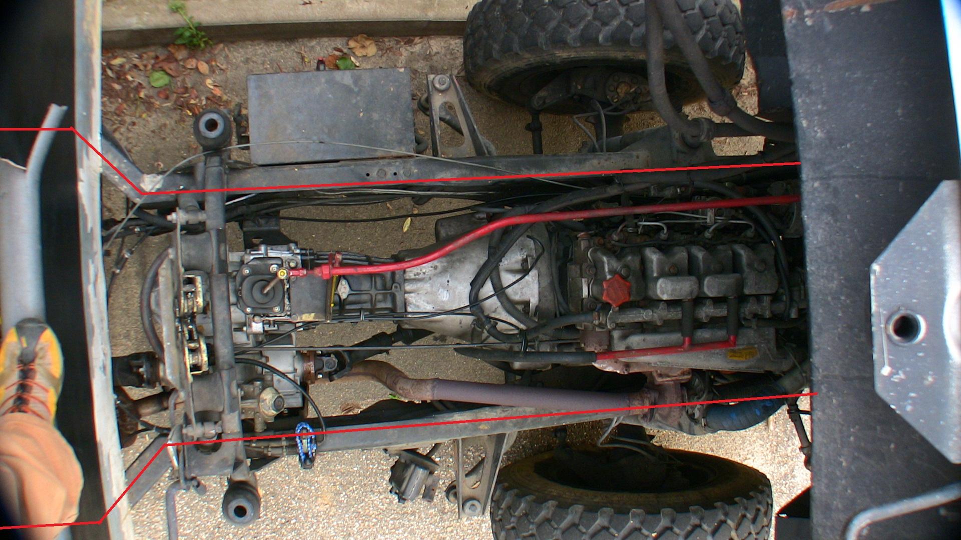 pour imaginer, l'espace entre mes 2 longerons correspondait a la largeur de la porte arriere puisque je pouvais circuler entre les 2, les traverses ayant été remplacées par des membrures en omega (comme le contour bas de cette porte arriere...) a angle de torsion équivalent, plus les longerons sont éloignés plus ils sont sollicités si on veut. (je recolle une image de la modif châssis vu du dessus en rouge)