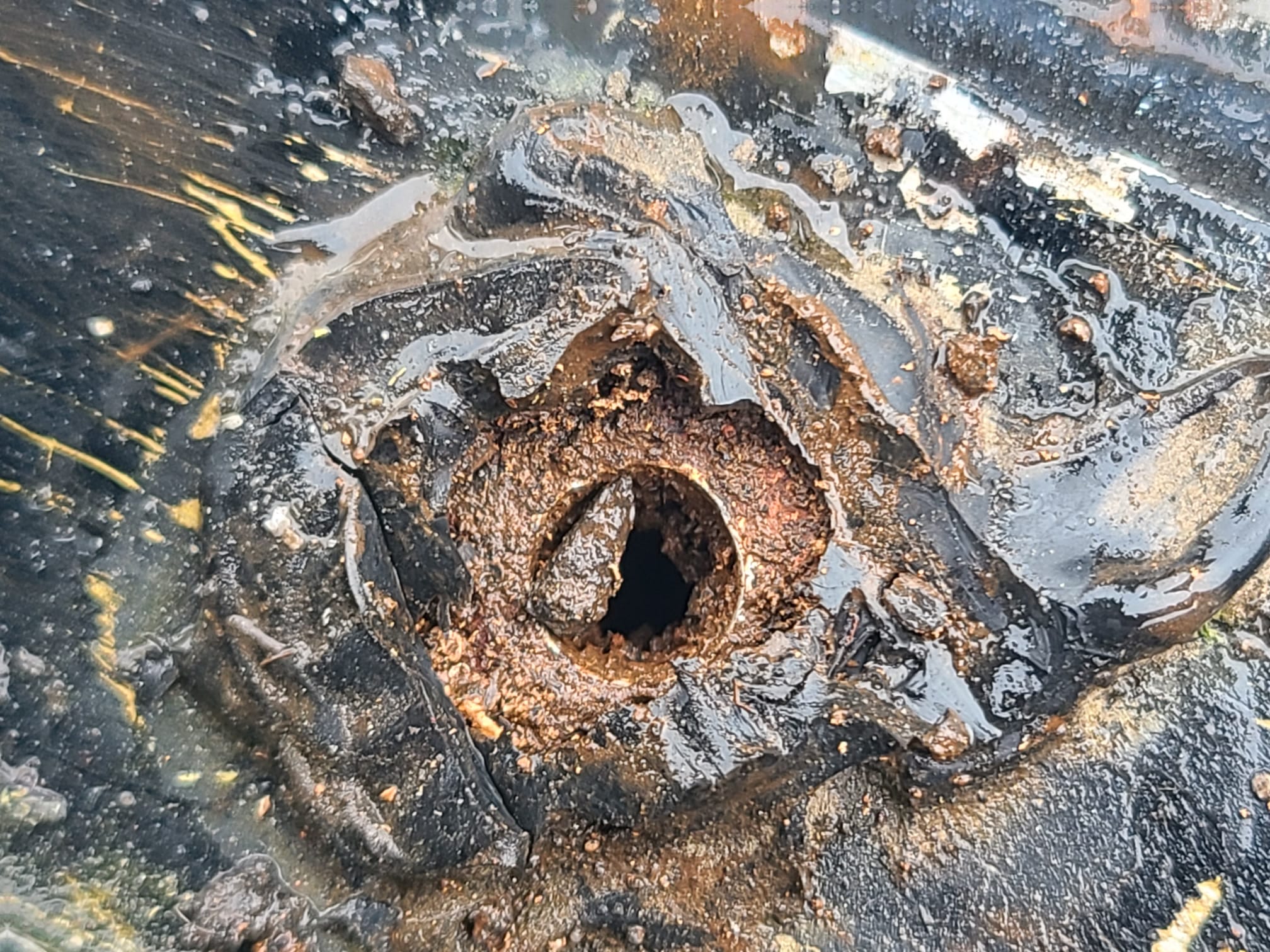 Le sandwich ctp du caisson en a pris un coup je pense, on a sur 1 ou 2 points comme une grosse cloque qui s'écrase sur le pied. Et clairement l'eau est bien rentrée.