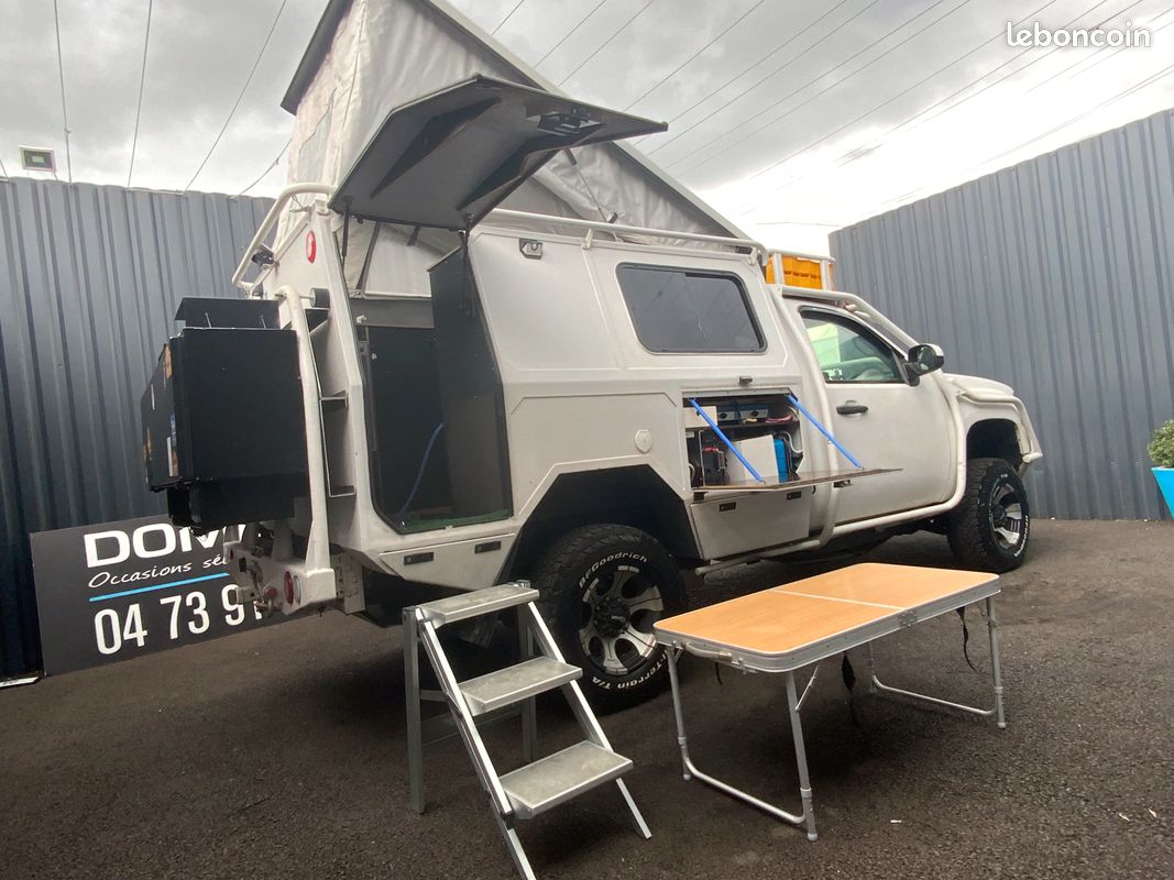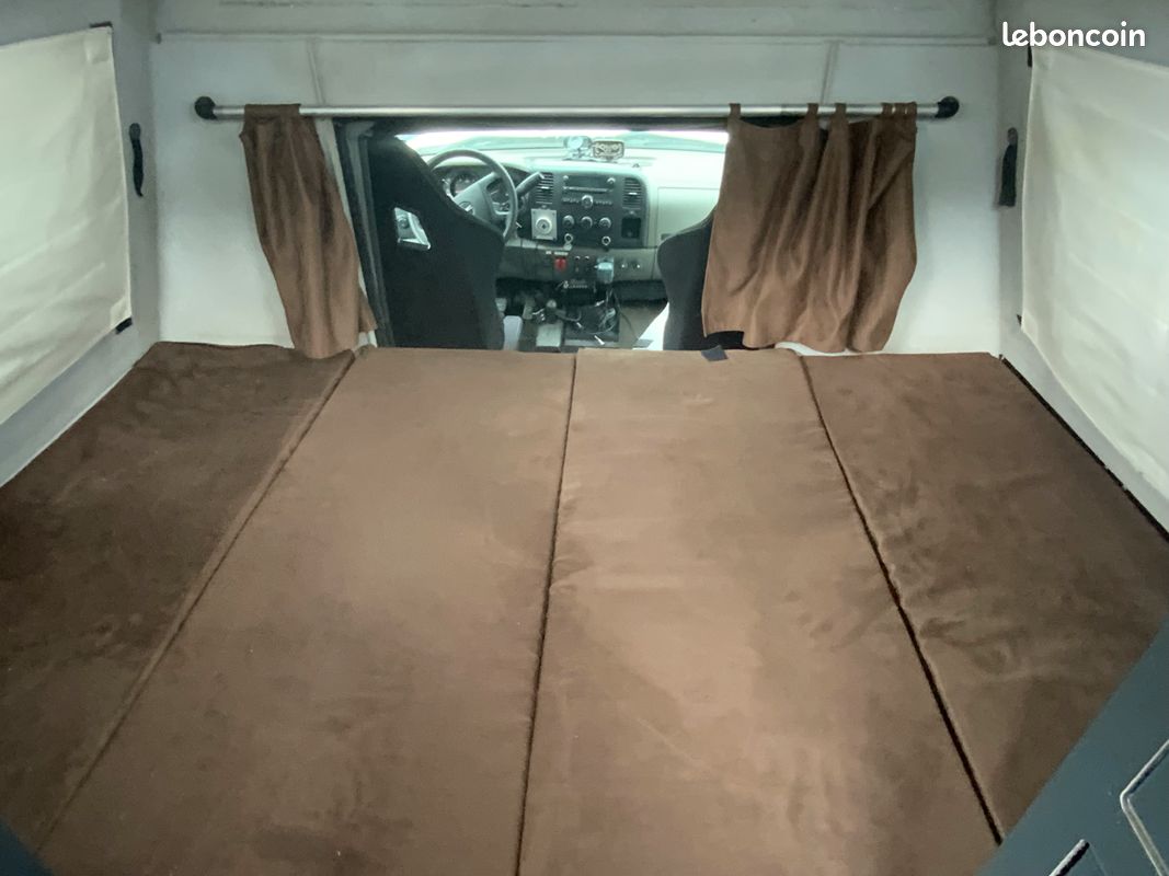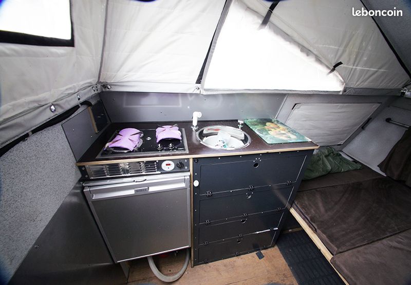 Chauffe eau - Frigo - gaz - évier. Plateau extérieur avec réchaud deux feux, prises d'eau, 12v, 220v.