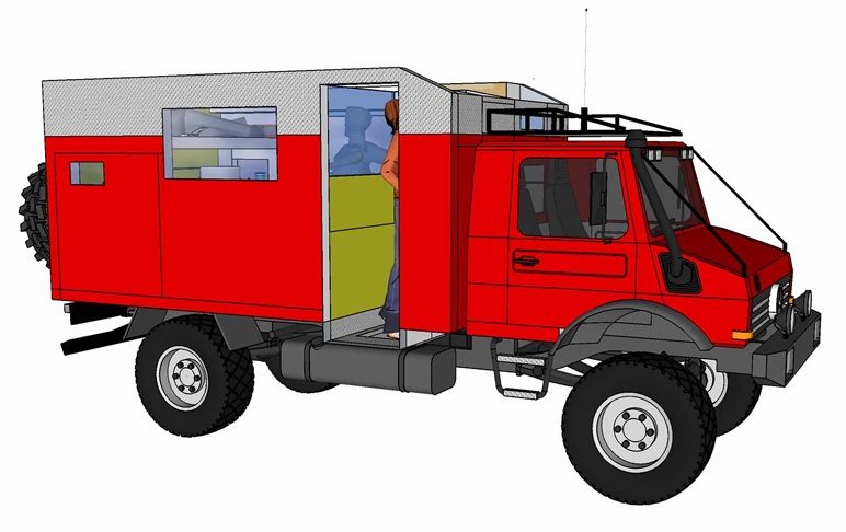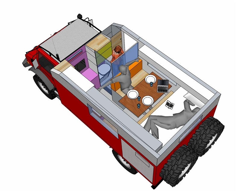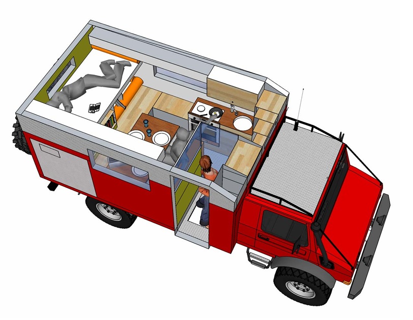 Ce qu'on voit pas bien sur le pdf (si vous voulez je peux aussi envoyer le fichier source Sketchup), c'est le deux lits superposés pour les enfants qui sont au dessus d'un grand coffre (d'ou maintient des volets pompiers, en plus de vouloir conserver le look pompier). Ce coffre sera aussi accessible via le hayon arrière d'origine. (permet aussi de ventiler la cellule et de donner plus d'espace au lit des enfants).