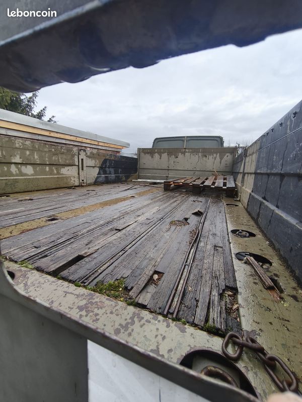 Benne en bon état, longueur utile environ 4,55 m (largeur/intérieure standard pour palettes NATO), fond bois d'origine avec traces d'usage normales.