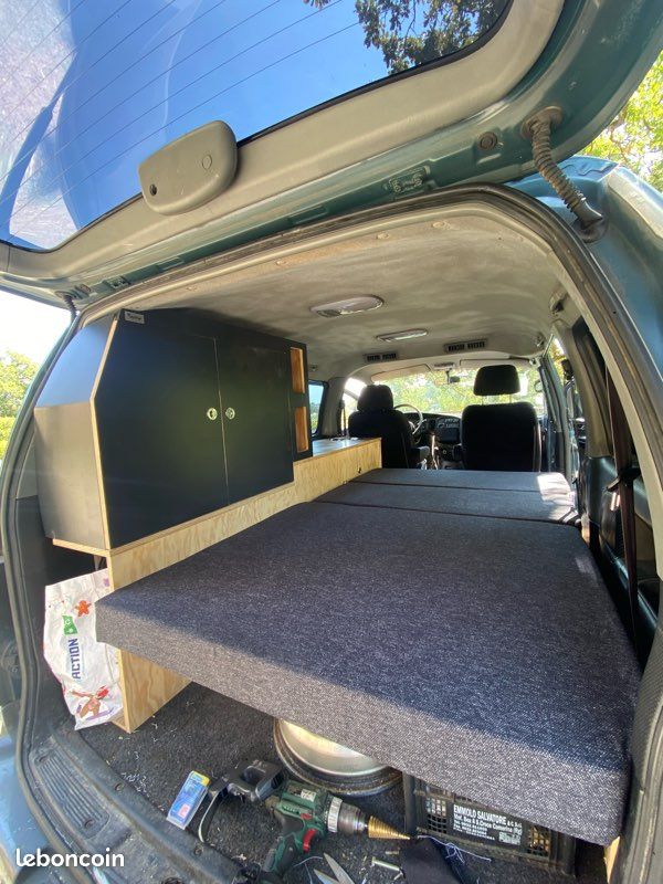 lit 2 places, évier, frigo à compression, batterie auxiliaire, panneaux solaires 200W + régulateur Victron, rangements