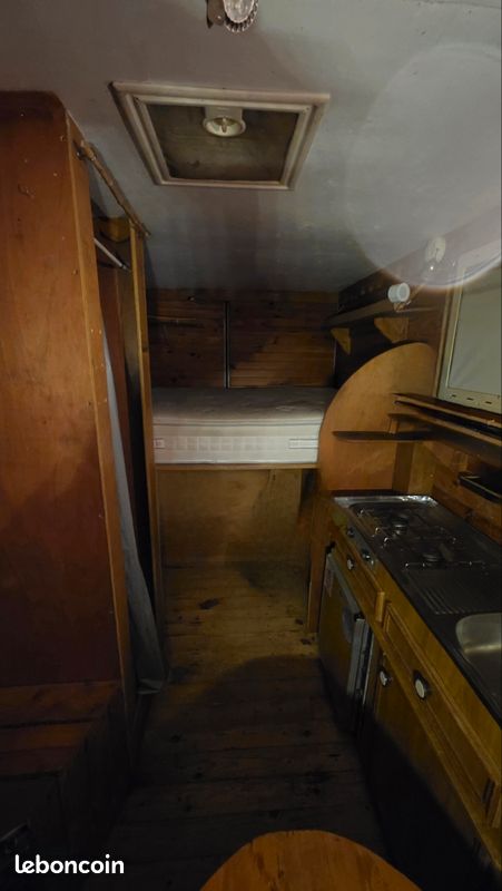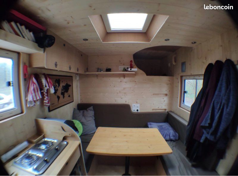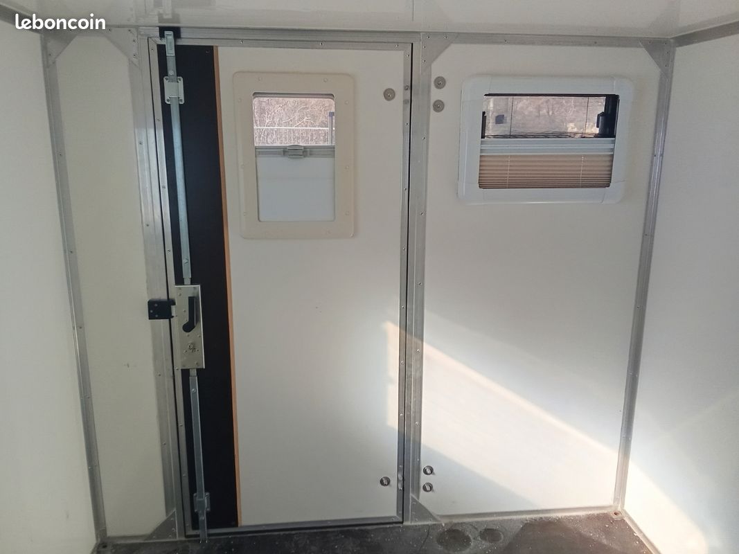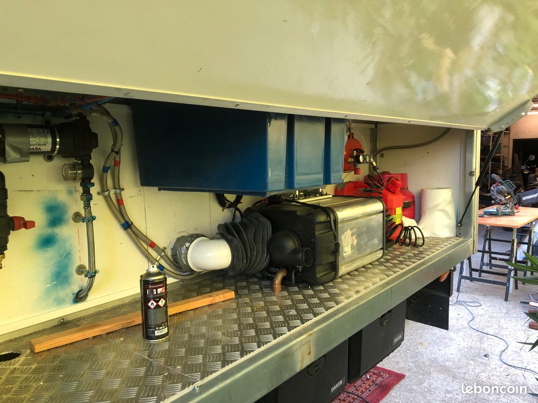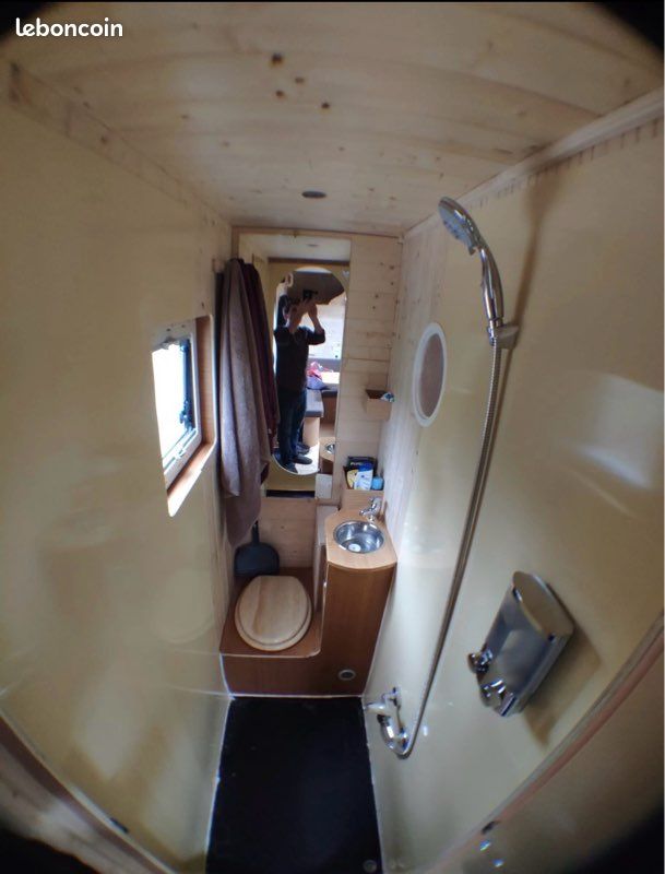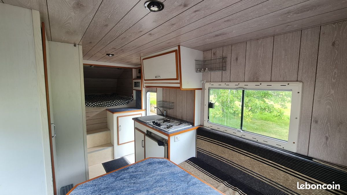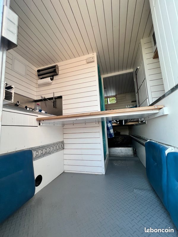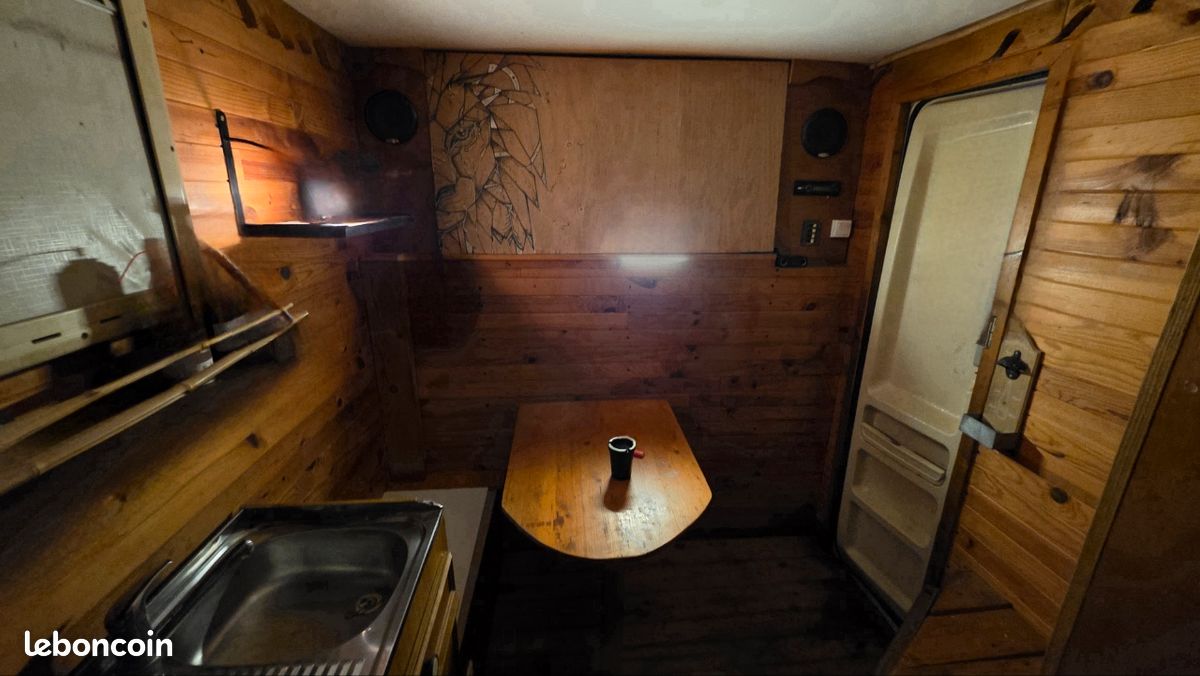 Bonjours caisse totalement aménager je précise vendu sans camion uniquement la caisse totalement étanche électricité à refaire sinon impeccable a été consu par ( les artisans du voyage ) visible sur leurs pages Facebook donc totalement au normes de sécurité : équipement cuve 400l eau propre cuve 400l eau grise compartiment pour 2 bouteilles de gaz rangement soute avec porte extérieur grand lit 2 places salon peut aussi accueillir 2 place et une petit couchette enfants plusieurs placard et rangement plaque 2 feux 1 four évier kitchenette douche toilette sèche écran vidéo projecteur amplificateur de son lit double avec panderie éclairage led prise mirale usb hdmi ext porte camping car fenêtre également vasistas ouverture 3 position avec moustiquaires à toutes les fenêtre volet oculant anti lumières la caisse et totalement isolé détecteur de fuite de gaz seul chose à faire c est l électricité et eau ballon sinon tout et en bonne état je précise la caisse et vendu seul et à venir récupérer