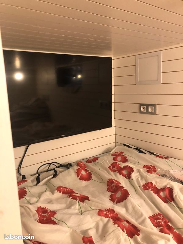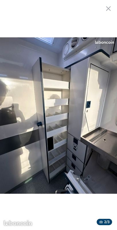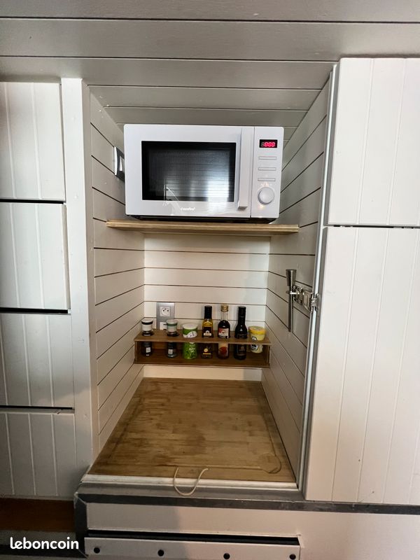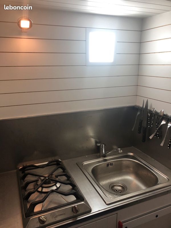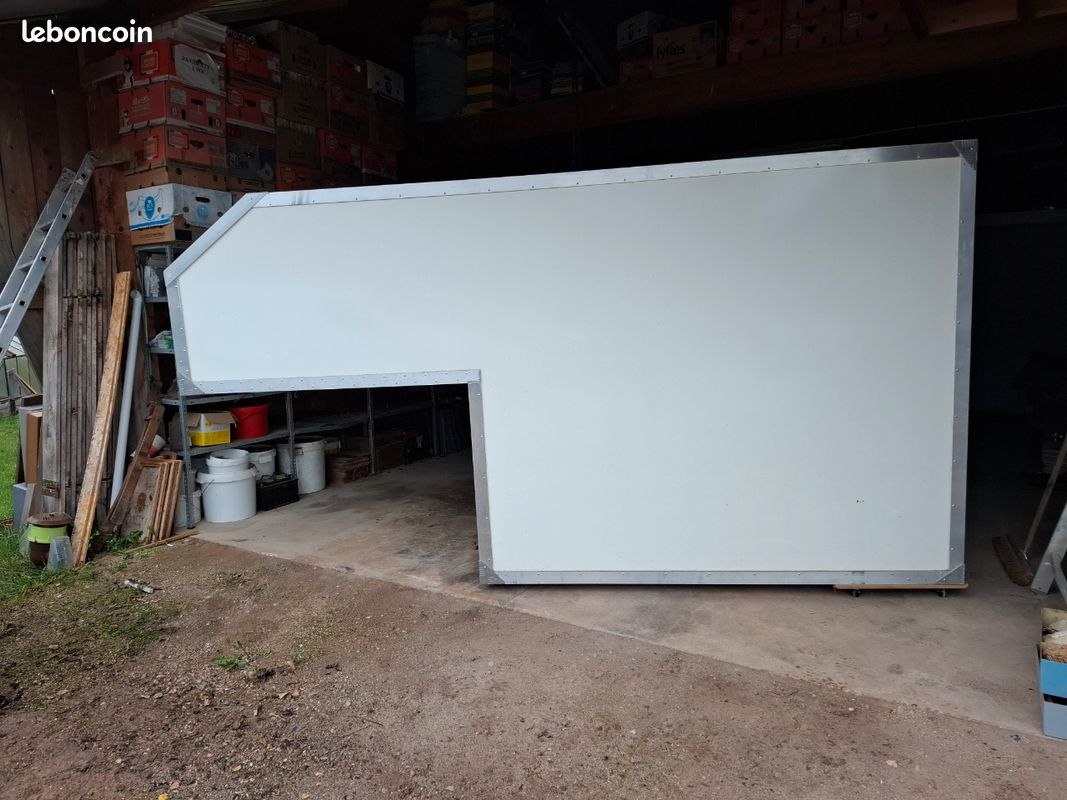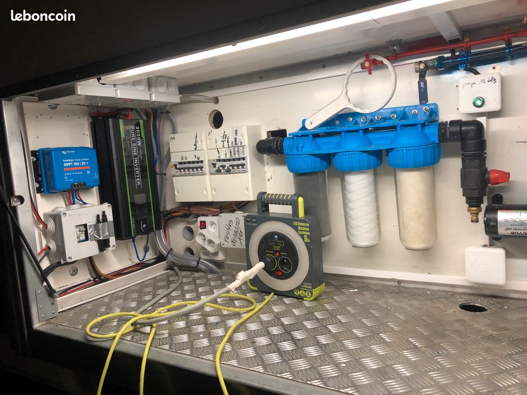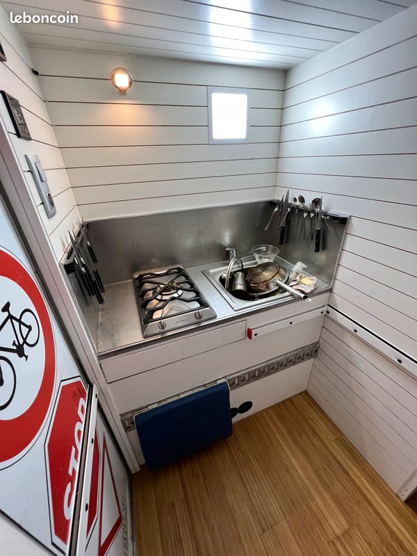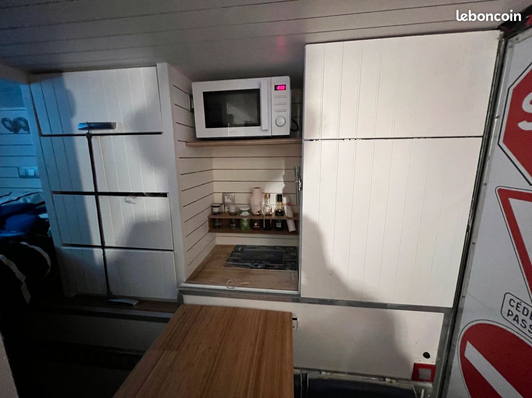 Bonjours caisse totalement aménager je précise vendu sans camion uniquement la caisse totalement étanche électricité à refaire sinon impeccable a été consu par ( les artisans du voyage ) visible sur leurs pages Facebook donc totalement au normes de sécurité : équipement cuve 400l eau propre cuve 400l eau grise compartiment pour 2 bouteilles de gaz rangement soute avec porte extérieur grand lit 2 places salon peut aussi accueillir 2 place et une petit couchette enfants plusieurs placard et rangement plaque 2 feux 1 four évier kitchenette douche toilette sèche écran vidéo projecteur amplificateur de son lit double avec panderie éclairage led prise mirale usb hdmi ext porte camping car fenêtre également vasistas ouverture 3 position avec moustiquaires à toutes les fenêtre volet oculant anti lumières la caisse et totalement isolé détecteur de fuite de gaz seul chose à faire c est l électricité et eau ballon sinon tout et en bonne état je précise la caisse et vendu seul et à venir récupérer