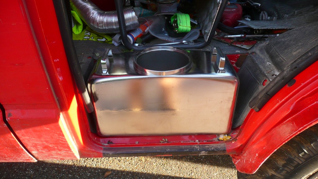 ou bien supprimer le fond de marche pied (c'est con leduc vient de les refaire ah ah ah) et descendre le reservoir de la moitié de sa hauteur pour monter dessus... bref..plein de possibilités..le plus dure va être de choisir et aussi de gérer le remplissage et retour de gasoil dans le cas de ceux qui servent au carburant..car par contre même s'il y a des poignées bien pratiques c'est pas non plus des jericanes...