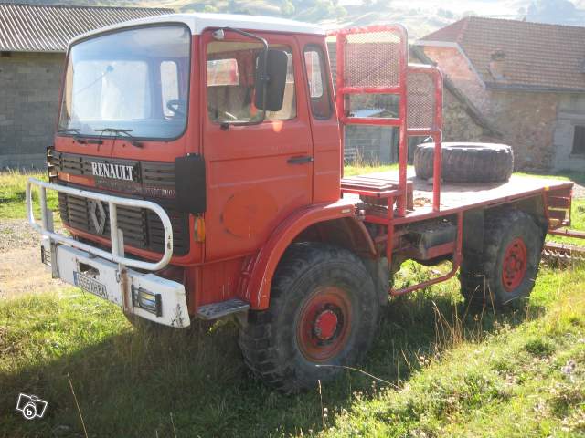 Vends camion Renault 4x4 75130, sans cuve, 40000 km an 81, treuil hydraulique, avec ou sans plateau Ar et son faux châssis, structure métal tube 120 x60 et IPN 80, plus plancher bois hydraufuge antidérapant neuf. et arrêt de charge en tube 60 x 60.