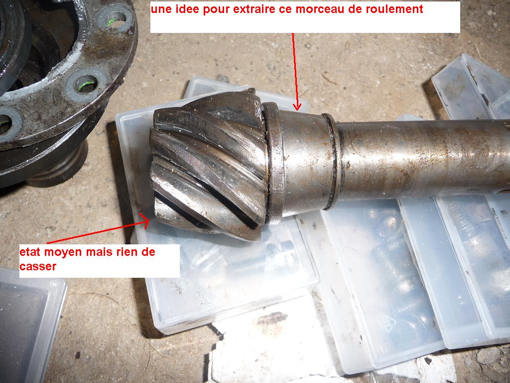 - ton pignon de l'arbre d'entrée ou de l'arbre menant du couple conique( la 3eme photo) semble quand même bien abimé