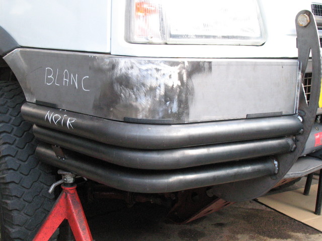 Moi je verrais bien deux petits longues portés rectangulaire en dessous des phares d'origines, incruster dans la plaque d'acier.