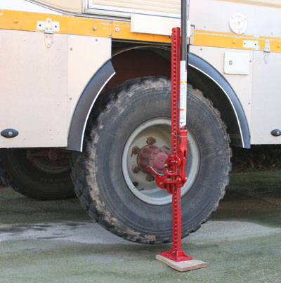 On peut même changer cette roue en mettant des cales sous le pont et en retirant le Hilift. Il est évidemment plus simple d’utiliser d’emblée le cric bouteille sous le pont.