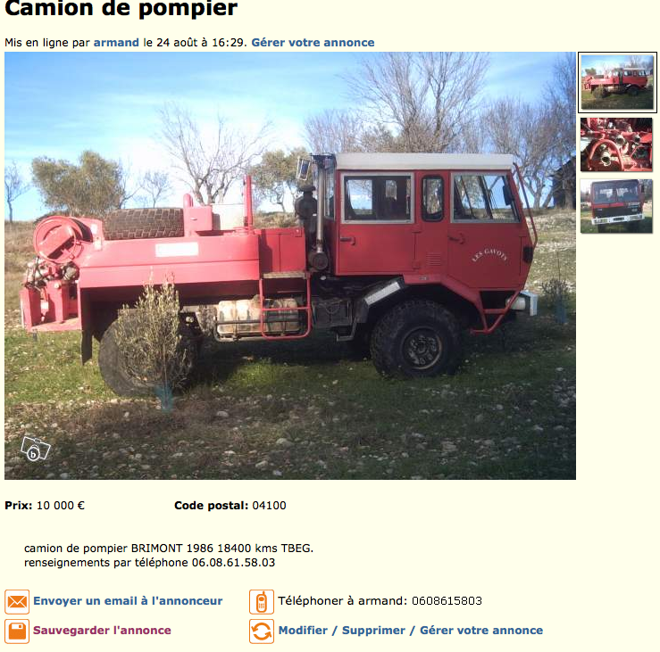 Les 2 ex-pompiers, ça fait un moment qu'ils sont à vendre.. celui du 62 pprends des € en + à chaque annonce.. :lol: