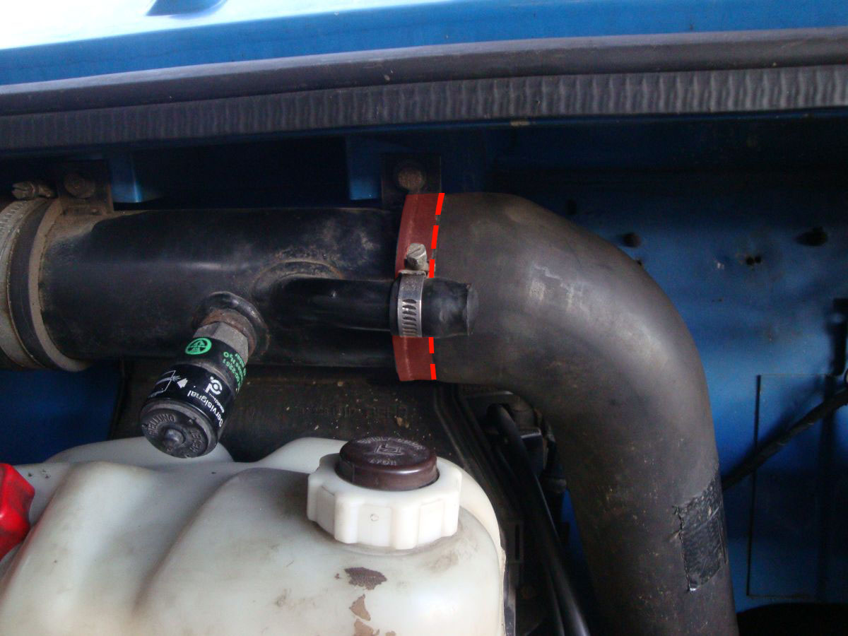 Et voilà, tout est en place et fonctionnel, il n'y a plus qu'à refaire le plein de liquide de refroidissement : Une fois tout en place je trouvais que la pipe intercooler>turbo était trop proche de la durit d'admission d'air filtre>turbo : Il suffit d'enlever une tranche d'environ 2cm à la durit et tout rentre dans l'ordre : (Cette durit est mon souffre-douleur, il avait déjà fallu que je la raccourcisse de l'autre côté