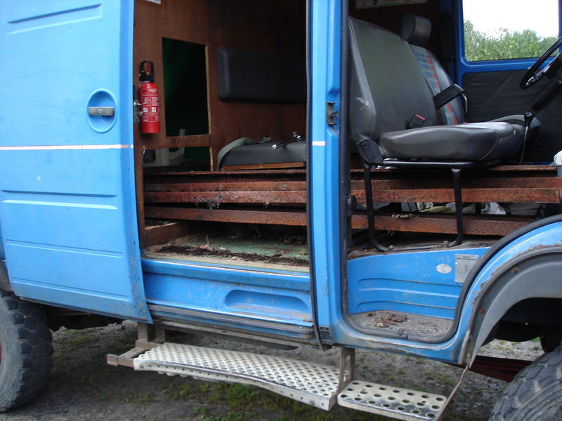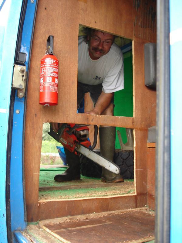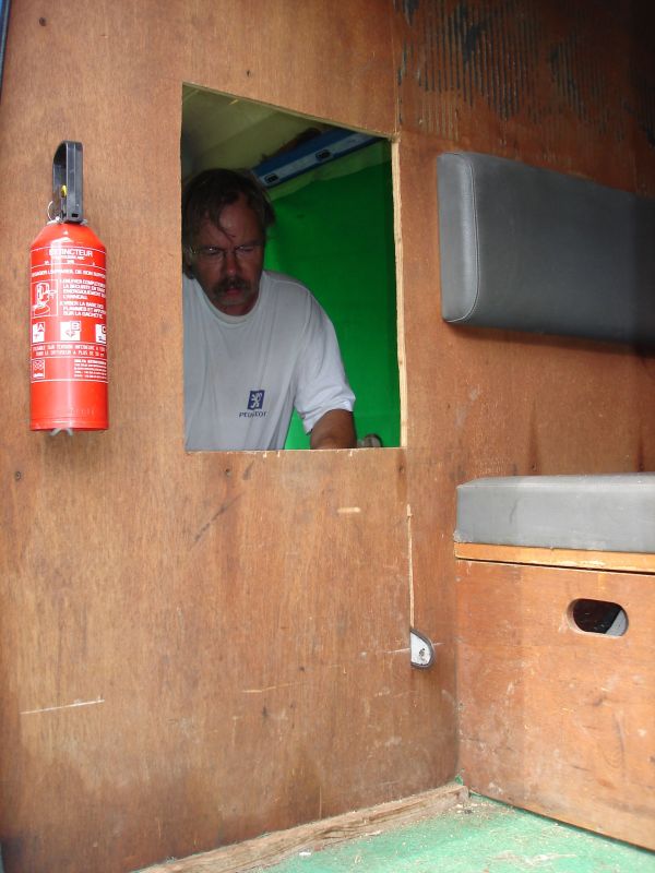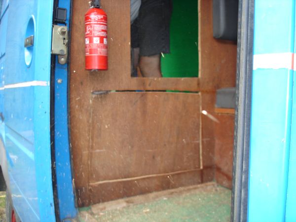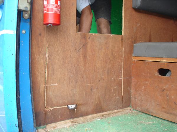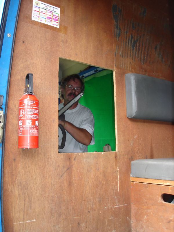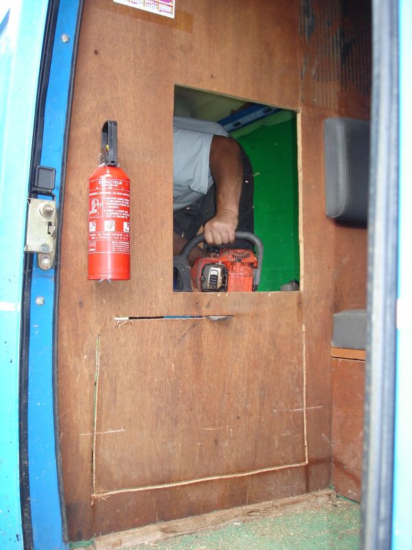 Vous faites une trappe pour le chien je suppose? Si c'est le cas pourquoi ne pas en profiter pour faire carrément une porte à taille humaine histoire de pouvoir accéder à l'arrière sans sortir du véhicule ou se contorsionner pour passer à travers ces petits trous que tu fais à la tronçonneuse