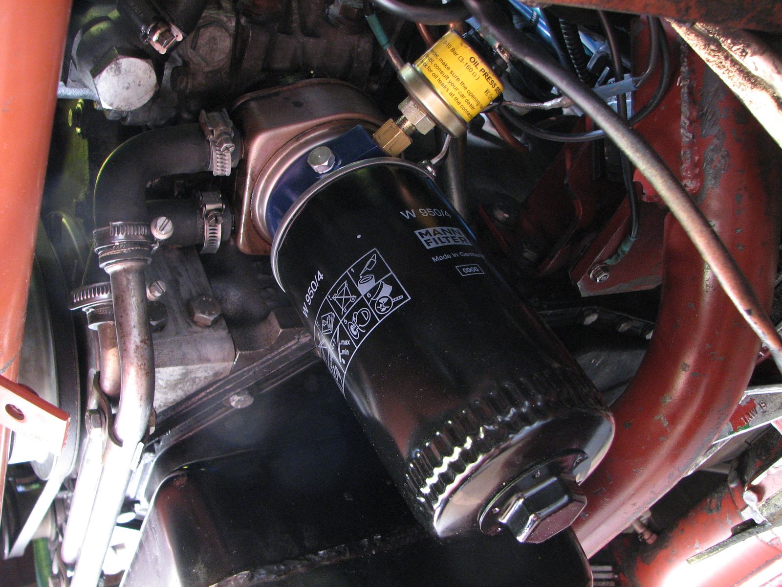 * on laisse en place le manostat d'origine et on garde la lampe de signalisation (pression basse) au tableau de bord; le manostat est difficile d'accés et on a peu de place pour y installer la sonde de pression d'huile (diam 45mm), à cause des nombreuses durits d'eau et huile qui passent dans le secteur,