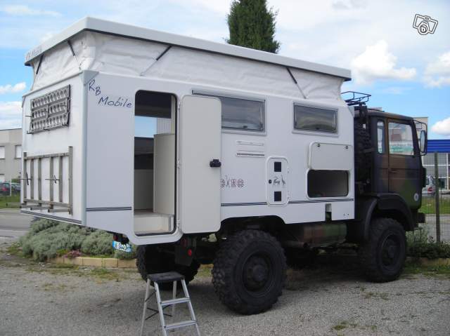 Camion 4x4 de voyage, Renault TRM 2000, 1° mise en circulation en 1983, entièrement reconditionné en 2007, 133500 km, très bon état, entièrement révisé. Carte grise VASP Camping car, 12cv, homologué 6 places assises, Longueur hors tout 5,40m, Poids à vide 4,55t, Poids total en charge 6t. Contrôle technique à jour. Aménagement réalisé en 2008 par un Pro. La particularité de ce camion est la communication intégrale entre la cabine et la partie arrière, de fait il y a un seul volume, comme un fourgon. Aménagement comme neuf, et camion mécaniquement entièrement révisé.