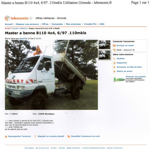 :::::rare master a benne B110 4x4 6/97.110mkls.très bon état . entretiens regulier avec carnait d'entretien a jour car le vehicule était d'une mairie..