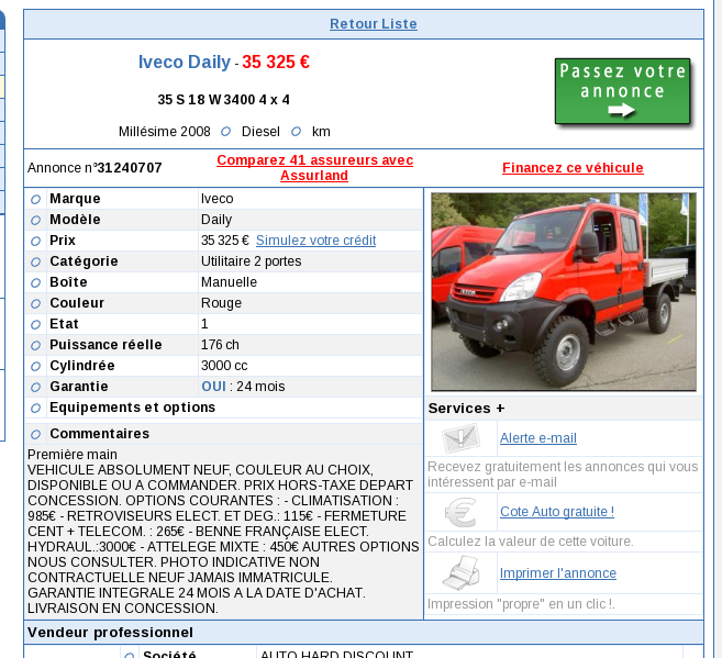En plus l'image de l'annonce citée en référence. C'est la photo d'un Daily 4x4 sur un salon de présentation.... Je crois que j'ai déjà vu cette photo quelque part. Un show room comme le transpontec : http://news.caradisiac.com/Nouvel-Iveco-Daily ou la manifestation de camion TT dans les Alpes, je ne sais plus comment ça s'appelle.