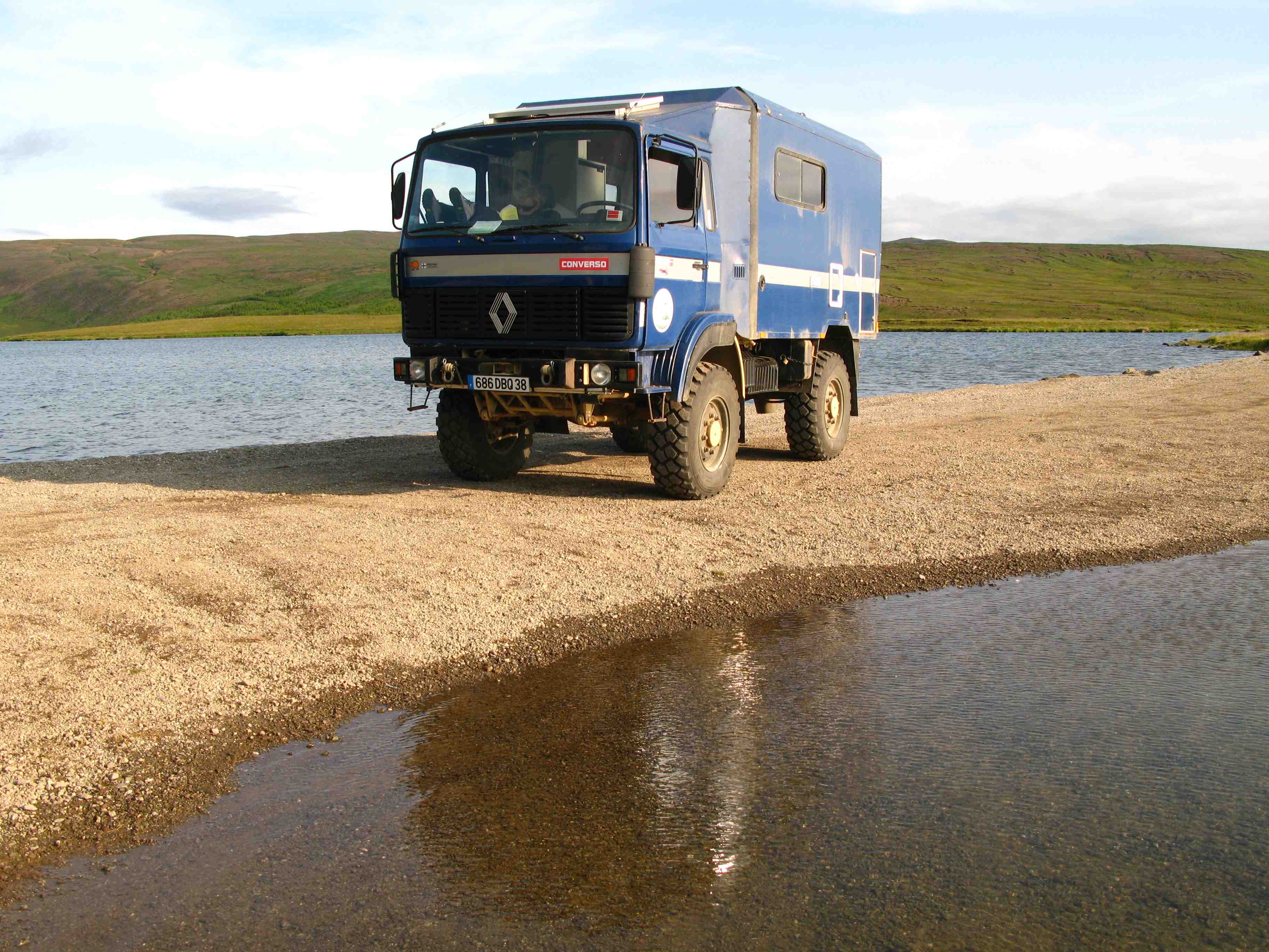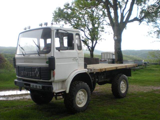 Camion 4x4 de voyage, Renault TRM 2000, 1° mise en circulation en 1983, entièrement reconditionné en 2007, 133500 km, très bon état, entièrement révisé. Carte grise VASP Camping car, 12cv, homologué 6 places assises, Longueur hors tout 5,40m, Poids à vide 4,55t, Poids total en charge 6t. Contrôle technique à jour. Aménagement réalisé en 2008 par un Pro. La particularité de ce camion est la communication intégrale entre la cabine et la partie arrière, de fait il y a un seul volume, comme un fourgon. Aménagement comme neuf, et camion mécaniquement entièrement révisé.
