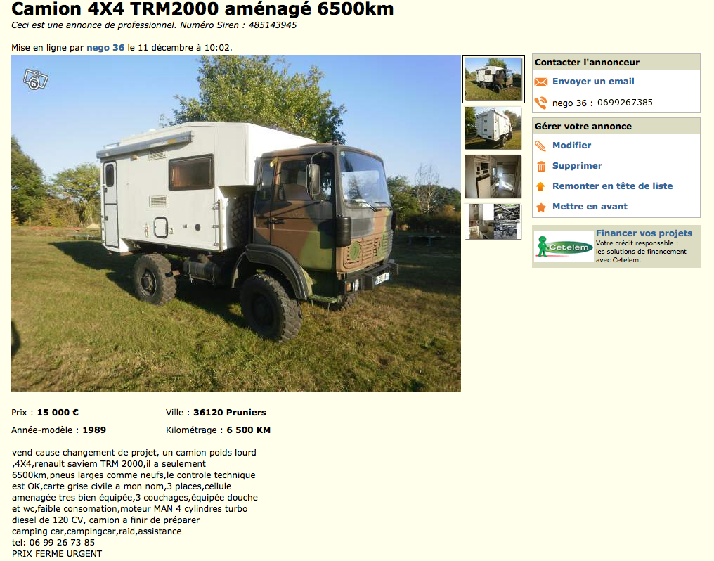 Et Dernière nouvelle, un lourd imprévu financier nous amène a reconsidérer nos projet; de fait notre camion n'est plus a vendre.